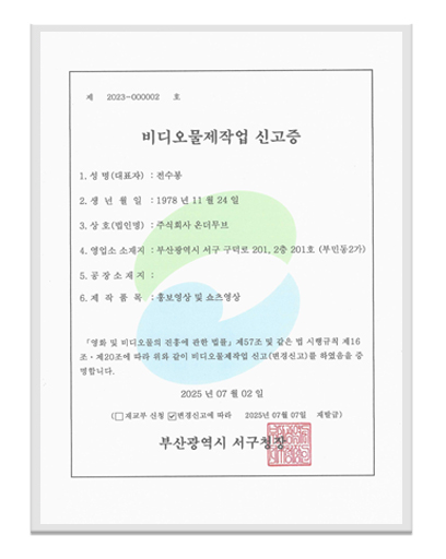 2023. 12. 비디오제작업 신고증 – 홍보영상 및 쇼츠영상 등 [서구청]