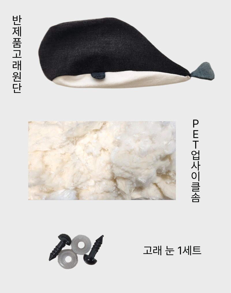 고래 인형은 한때 버려진 청바지가 아이들의 손끝에서 다시 태어난, 따뜻한 감정을 품은 창작물입니다. 고래 인형 키트는 폐청바지 원단(랜덤 컬러), 100% 리사이클 PET 솜, 고래 눈 부자재, 금속 키링 또는 군번줄로 구성되어 있습니다. 바느질 없이 간단히 조립만으로 완성할 수 있어 누구나 쉽게 참여할 수 있습니다. PET병을 다시 가공해 만든 솜을 직접 채워 넣으며 나만의 고래를 완성하는 과정은 성취감과 함께 지속가능성의 의미를 자연스럽게 전해줍니다.