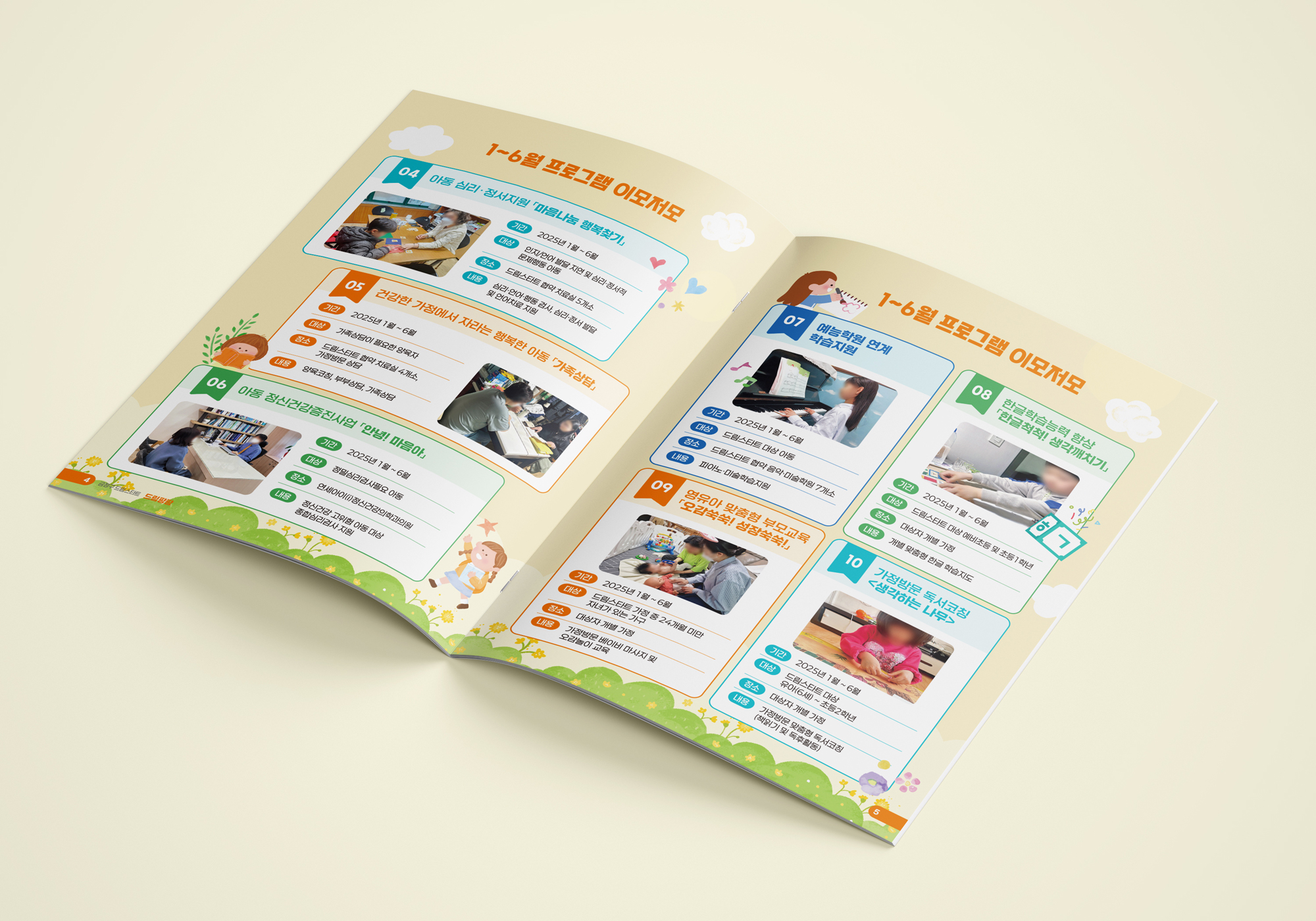 사업 안내 페이지는 본래의 정보 구조를 유지하면서 활기찬 색감과 그래픽 요소를 구성했고 사진과 일러스트를 조화롭게 믹스해 현장의 생생함과 친근한 느낌으로 디자인하였다.