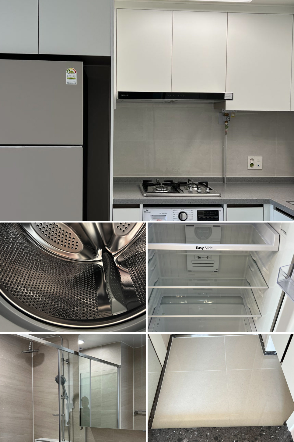 먼저고온 스팀세척과 컬비분진케어로 남아있던 먼지와 오염을 깨끗하게 청소하였습니다. 세탁기와 냉장고 내부, 창틀, 천장, 몰딩 등 손이 닿기 어려운 곳까지 철저히 청소했으며, 에어컨 커버 및 필터, 하부장과 서랍장, 환풍구와 수전도 꼼꼼히 세척했습니다. 마무리로 피톤치드 연무 소독과 욕실 탈취 작업을 진행하여 공기 정화와 쾌적한 환경을 완성했습니다.