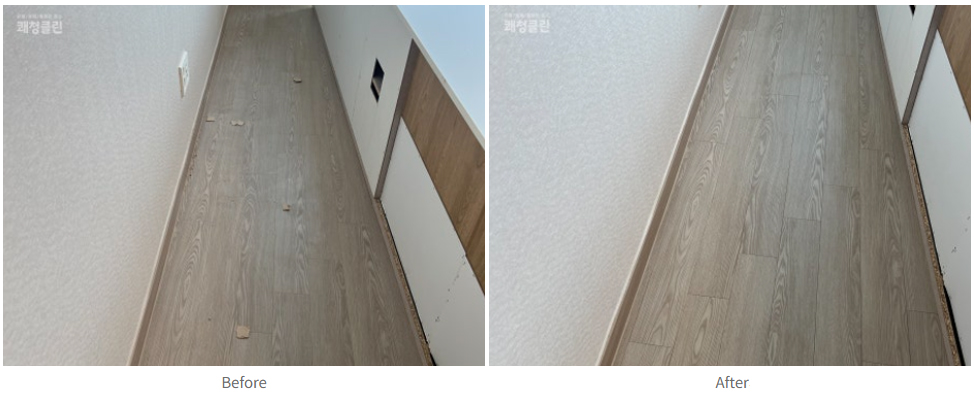 쾌청클린은 컬비분진케어를 활용해 다량의 분진을 제거하고, 천장과 몰딩, 벽면, 창문틀 등 손이 닿지 않는 부분까지 꼼꼼하게 청소했습니다. 또한 바닥과 문틀, 욕실 내 잔여 공사 오염을 제거하고, 매트리스와 에어컨 내부까지 깨끗하게 청소했습니다.