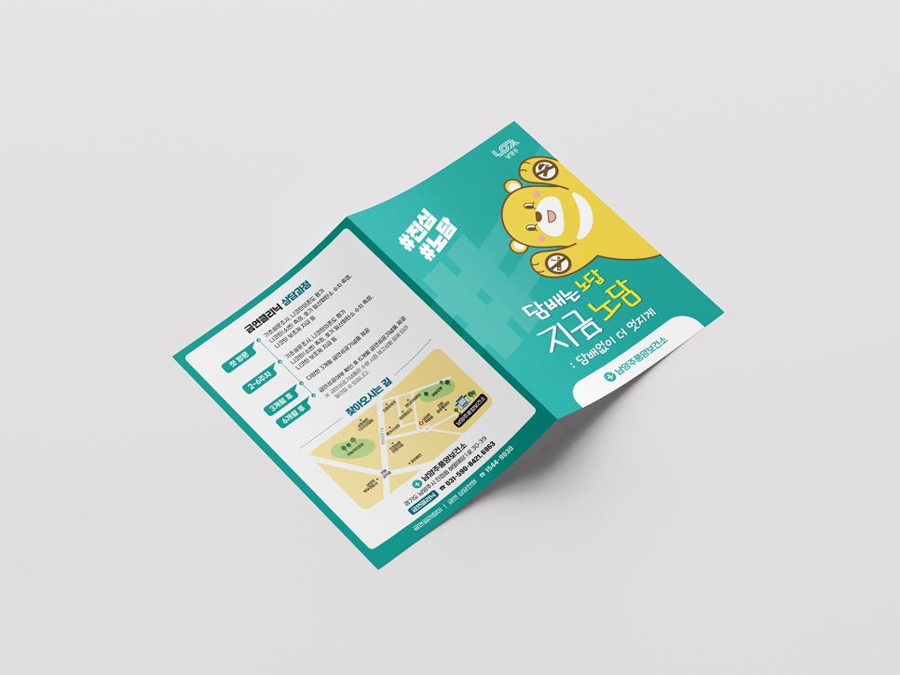 리플릿 표지는 금연 캠페인의 공식 캐릭터인 노담베어와 ‘담배는 노답, 지금 노담’ 슬로건을 중심으로 구성하여 금연 메시지를 밝고 유쾌한 분위기로 전달하도록 하였다. 또한 보건소의 CI와 캐릭터 톤에 맞는 컬러와 그래픽 요소를 적용해 전체 디자인의 통일감을 높였다. 내지는 금연클리닉 이용 안내와 건강 정보를 직관적으로 이해할 수 있도록 정리하였으며, 지도와 주요 정보는 일러스트와 인포그래픽 중심으로 구성해 가독성을 높였다.