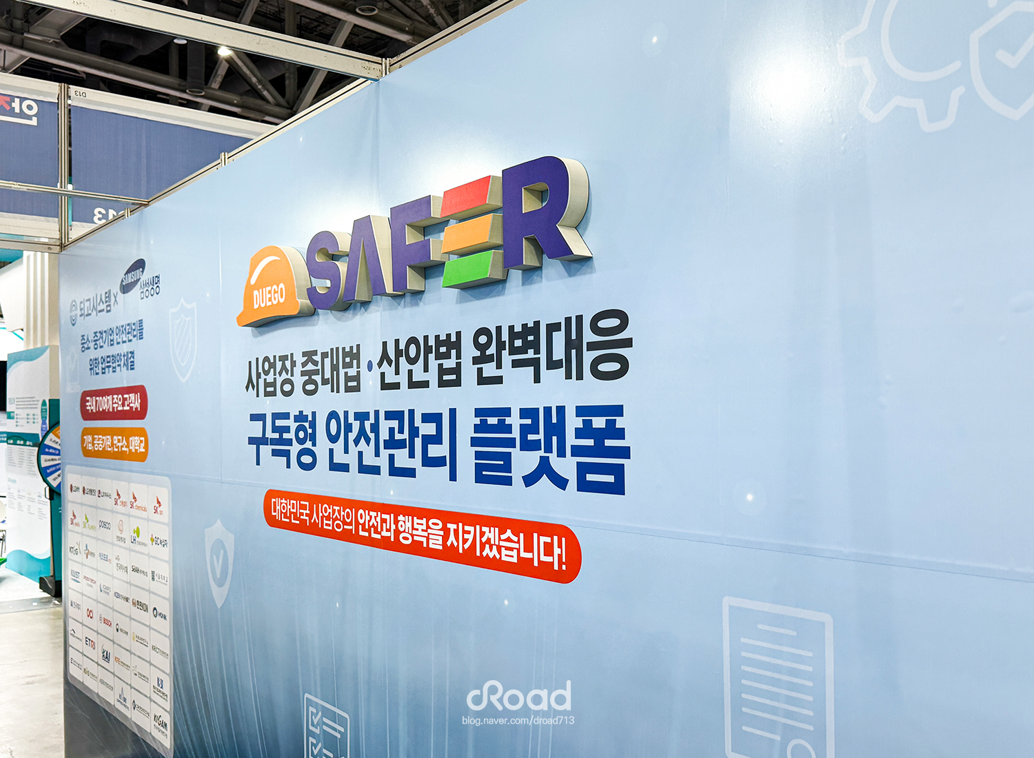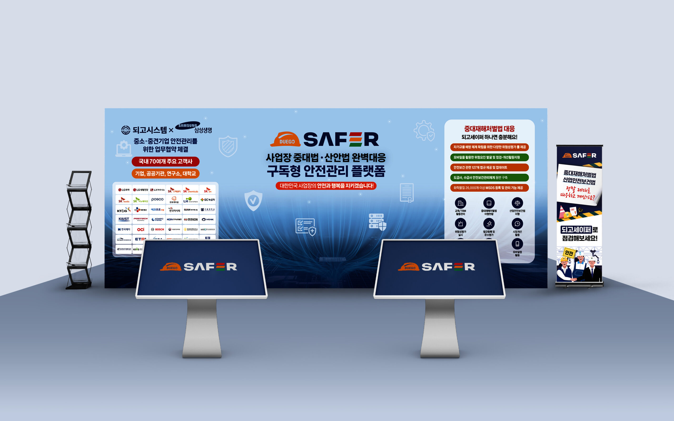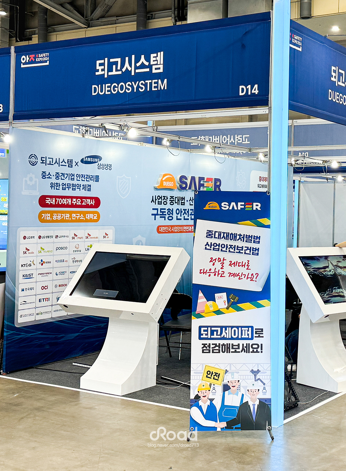 되고시스템은 안전관리 정보화 전문기업으로, 안전·보건·환경 및 화학물질 관리 시스템을 개발하여 공공기관, 대기업, 연구기관 등 다양한 고객층에서 높은 신뢰를 얻고 있는 기업이다. 디로드는 2024 대한민국 안전산업 박람회에서 되고시스템 부스의 옥타부스 백월 디자인과 시공을 진행하였다. 밝은 파랑 배경과 좌우 배치로 브랜드 집중도를 높였고, 키오스크 전면 타이틀과 중대법·산안법 대응 X배너를 추가해 주목도를 강화하였다. 로고는 입체감 있는 고무스카시로 제작해 시선을 끌었으며, 짧은 설치 시간과 목업 부스와 동일한 모습으로 완성되어 박람회 운영 효율성을 높였다. 방문객들은 전문성과 직관성을 동시에 느끼며 만족감을 표하였다. 이번 프로젝트를 통해 디로드는 고객의 비즈니스 목표 달성에 기여하며, 집중도 높은 부스 디자인과 시공 능력을 입증하였다.