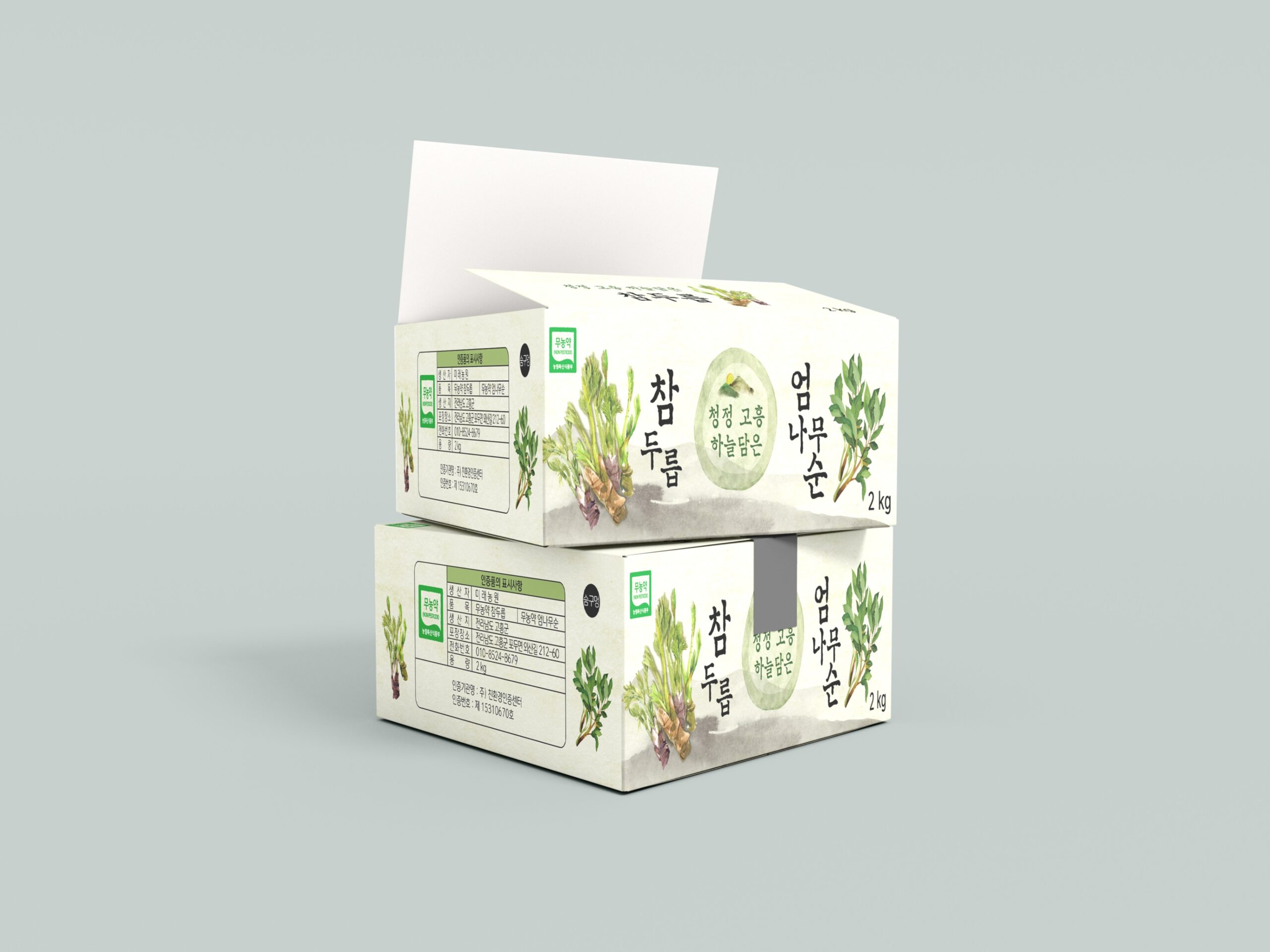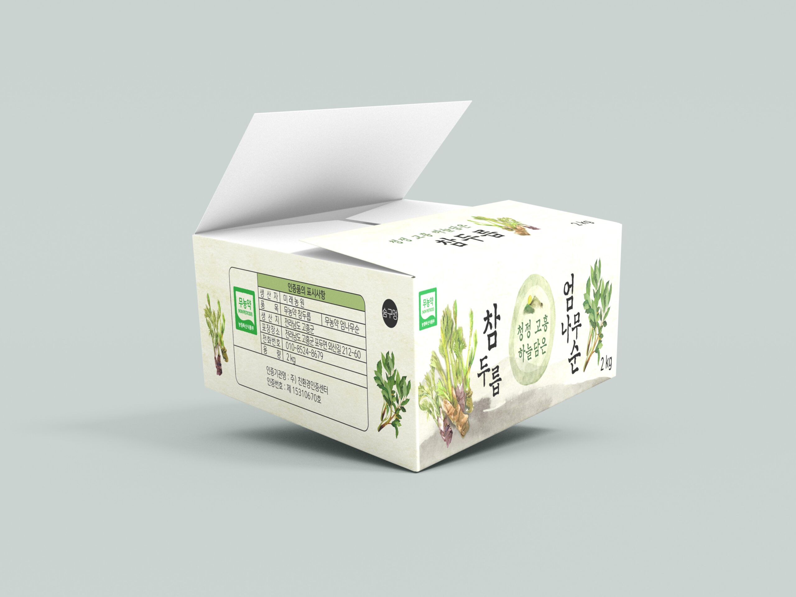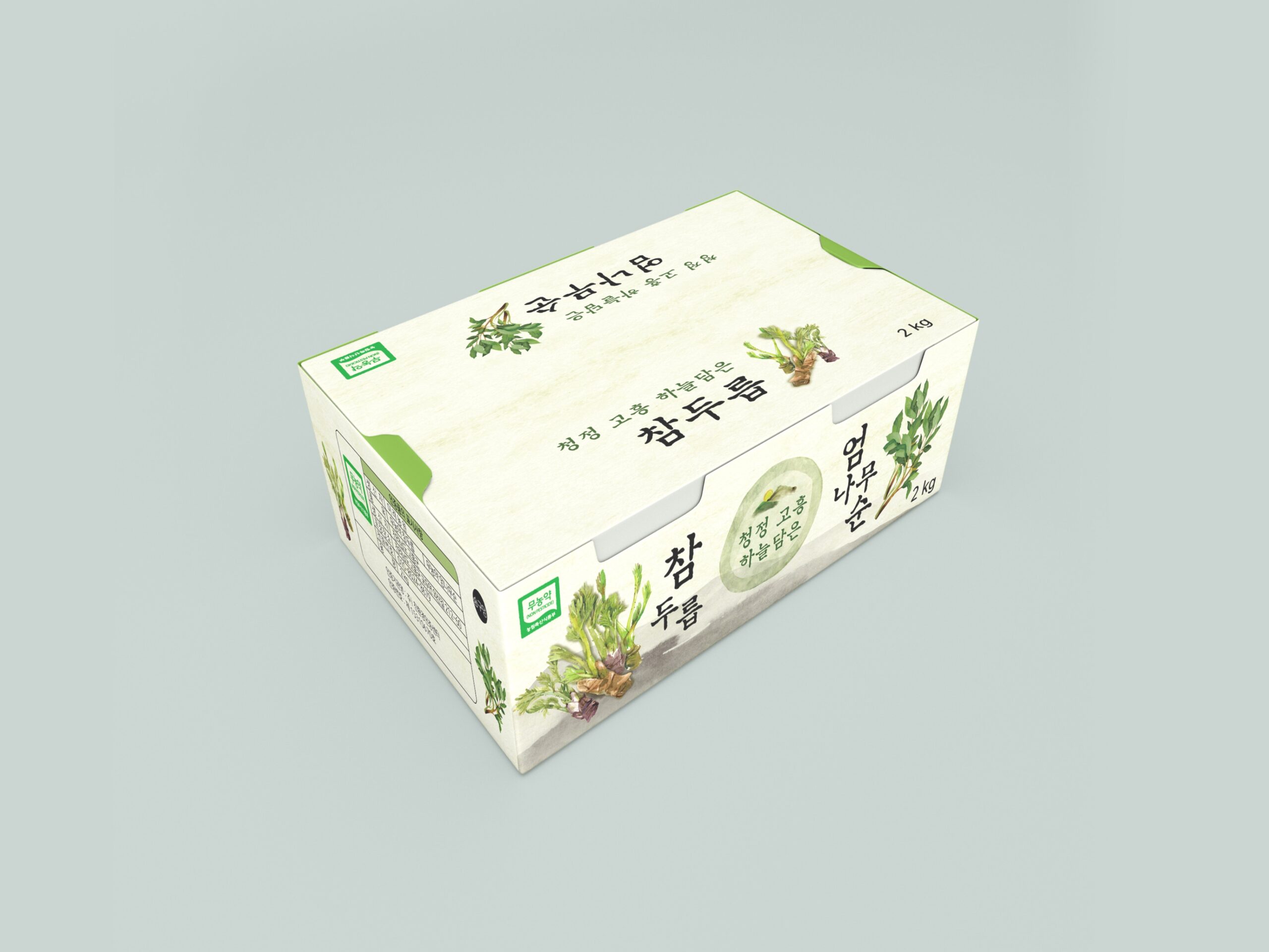 소비자에게 친환경 자연이 키운 무농약 야생 ‘참두릅’과 ‘엄나무순’을 안전하게 전달하기 위한 박스를 제작하였다.