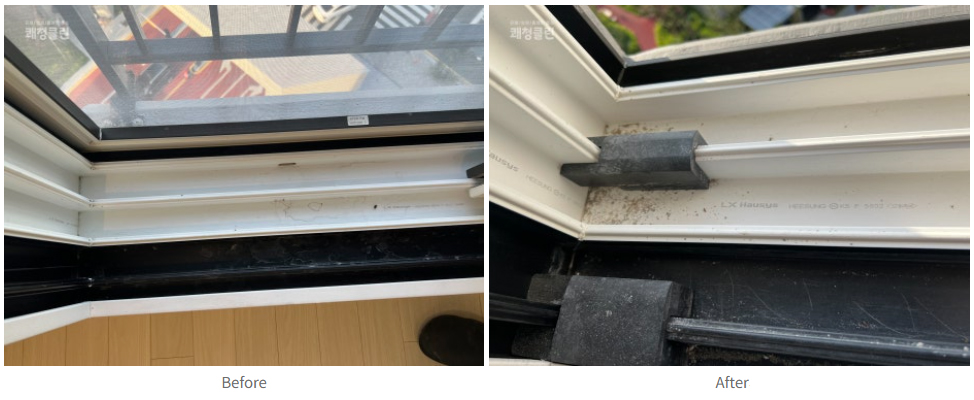 내부의 분진과 미세먼지, 유해 물질은 컬비 분진 케어를 활용해 제거하였고 창틀 먼지는 고온 스팀 세척으로 꼼꼼히 청소하였습니다. 또한 건강과 안전을 생각해 친환경 세제를 사용하였습니다.