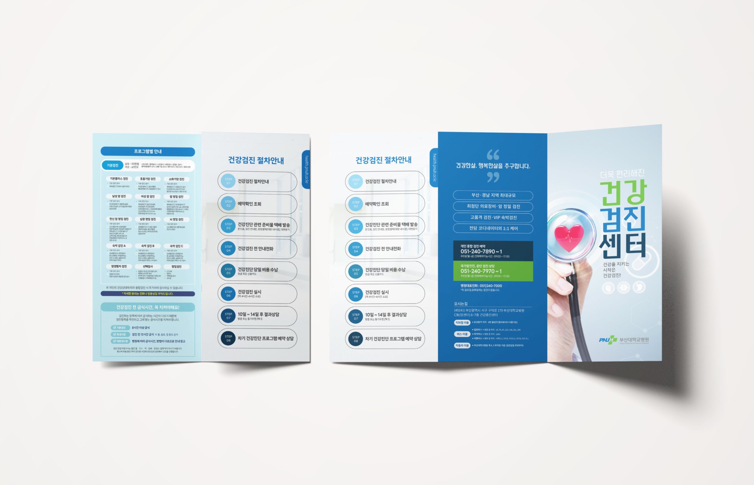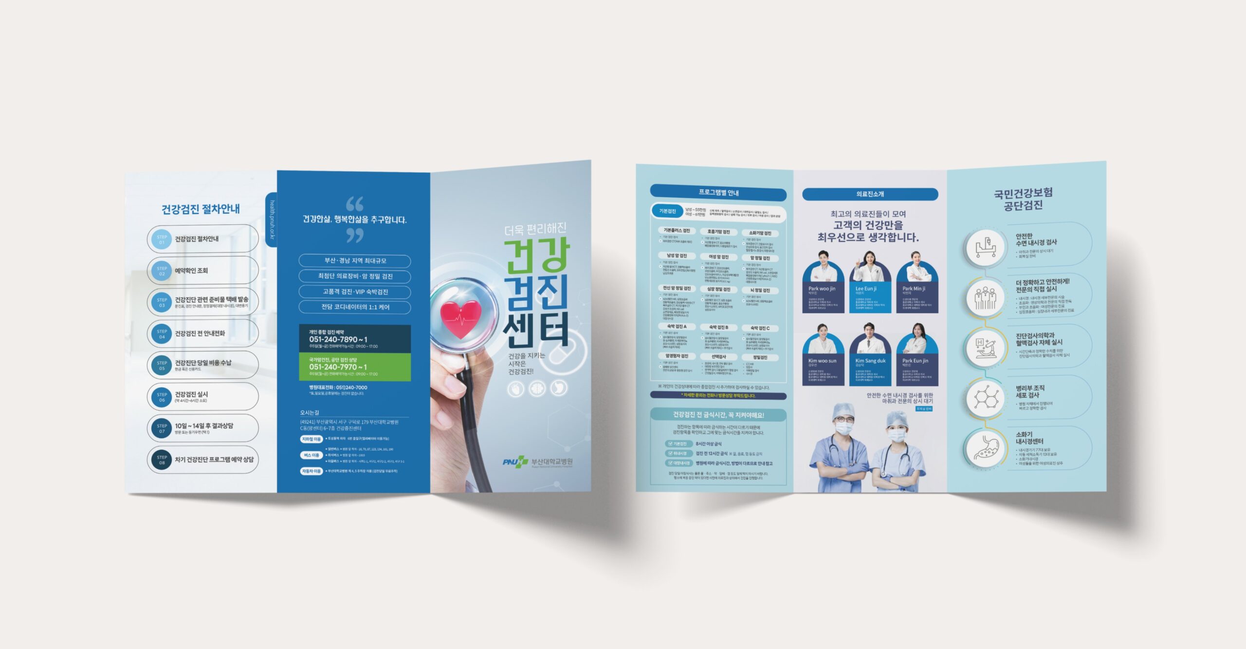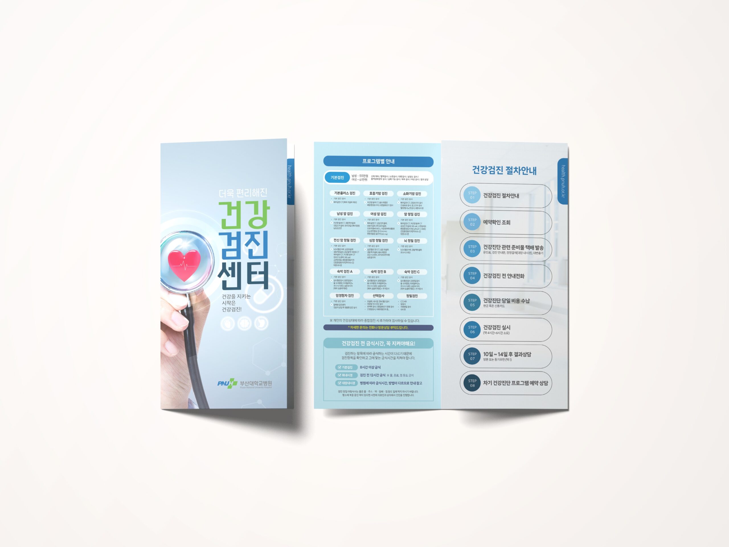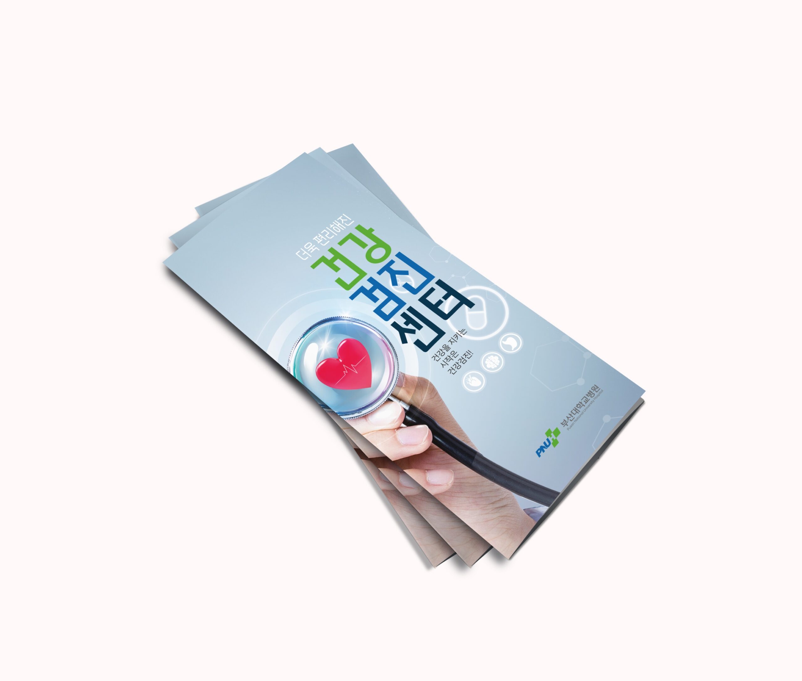 부산대학교병원 건강검진센터 리플릿은 건강검진을 이용하는 연령대가 보편적인 흐름으로 정보를 인지할 수 있도록 기본 3단접지 리플릿으로 작업을 진행하였고, 부산대학교병원 CI 컬러를 사용하여 병원 아이덴티티를 함께 형성해 주고자 하였다.
