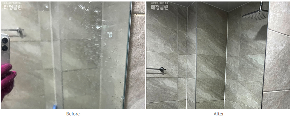 작업 : 고압 스팀세척, 친환경 세제 반복 세정, 틈새 곰팡이 제거, 유리 물때·곰팡이 제거