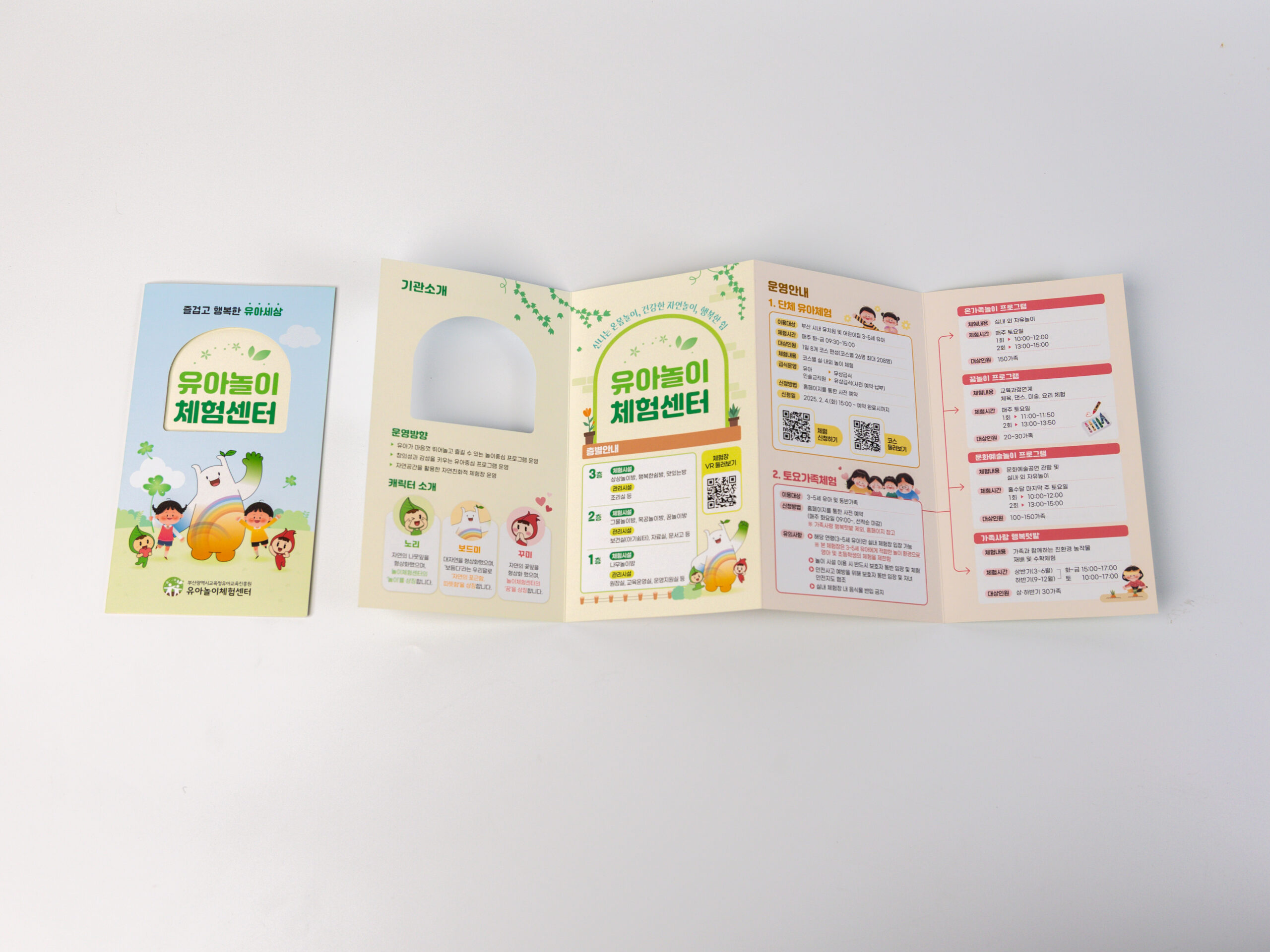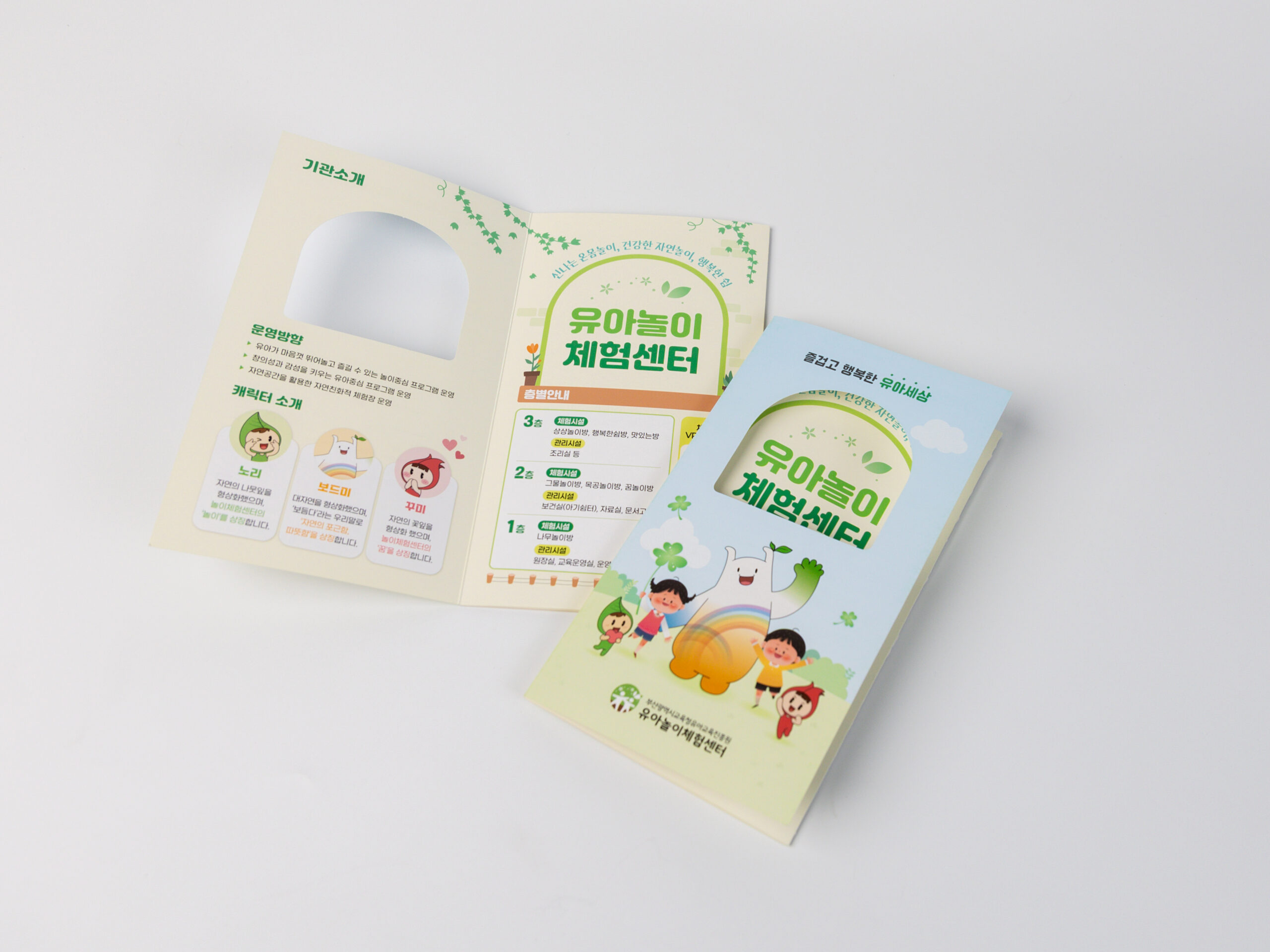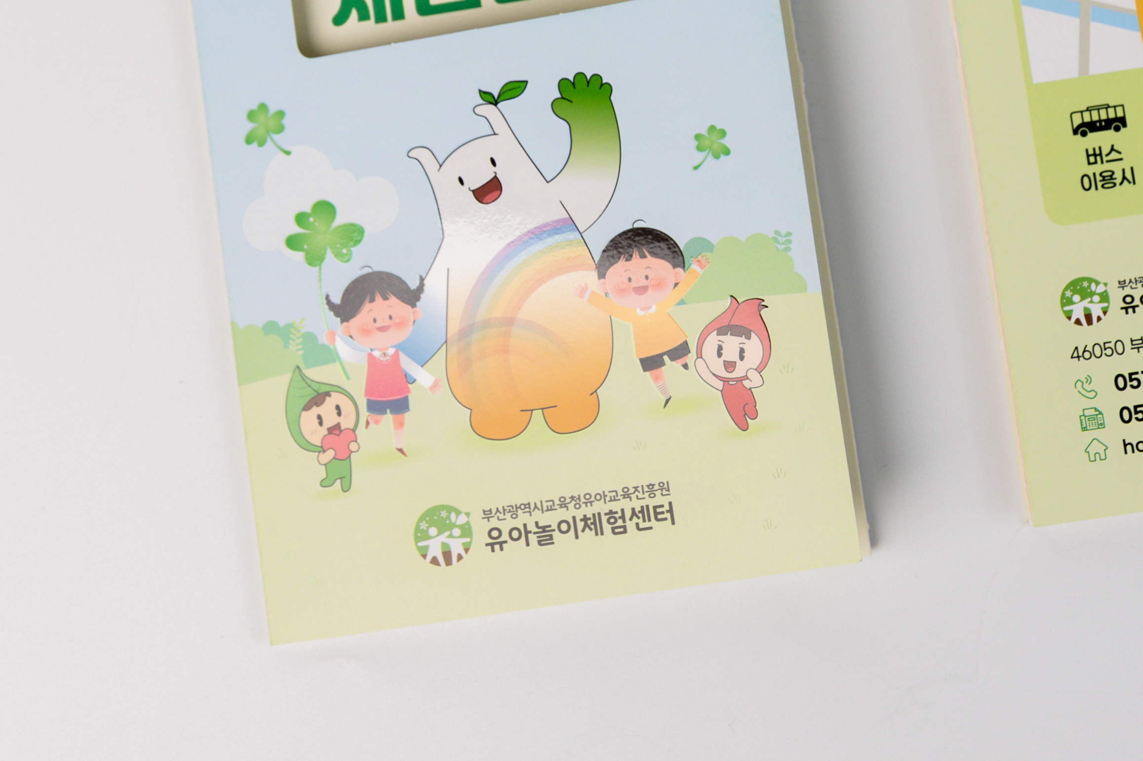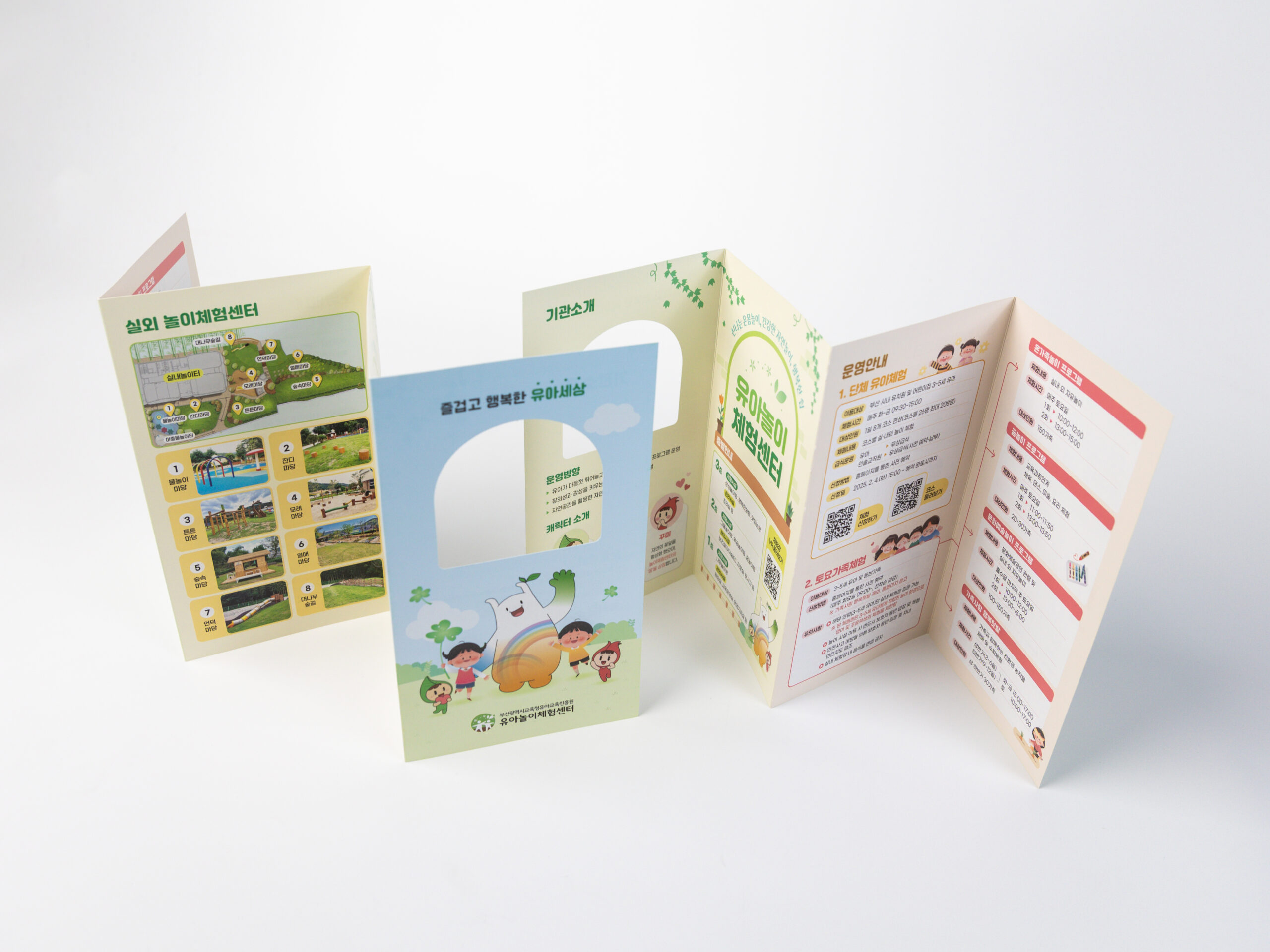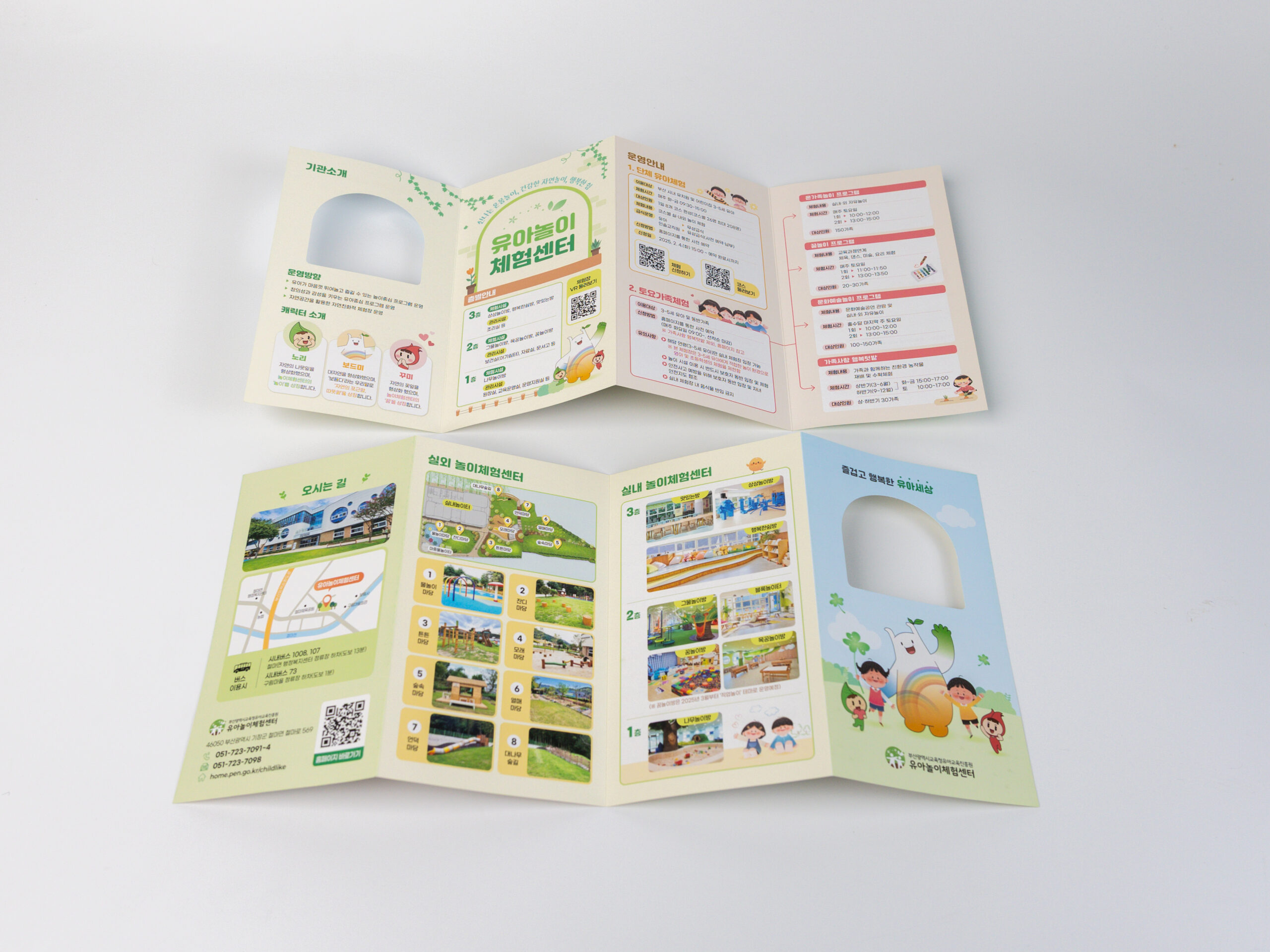 부산광역시교육청유아교육진흥원에서 의뢰해 주신 ‘유아놀이체험센터 4단리플릿’ 제작에 참여하였다. 리플릿은 전단지 형태 이외에도 다양한 접지 형태를 선택할 수 있는 것이 특징이다. 이번 리플릿은 다양한 4단접지 방식 중 지그재그 형태의 병풍접지를 선택하고 둥근 창문형 도무송을 적용해 내지에는 큰 타이틀이 잘 드러나도록 진행하였다.