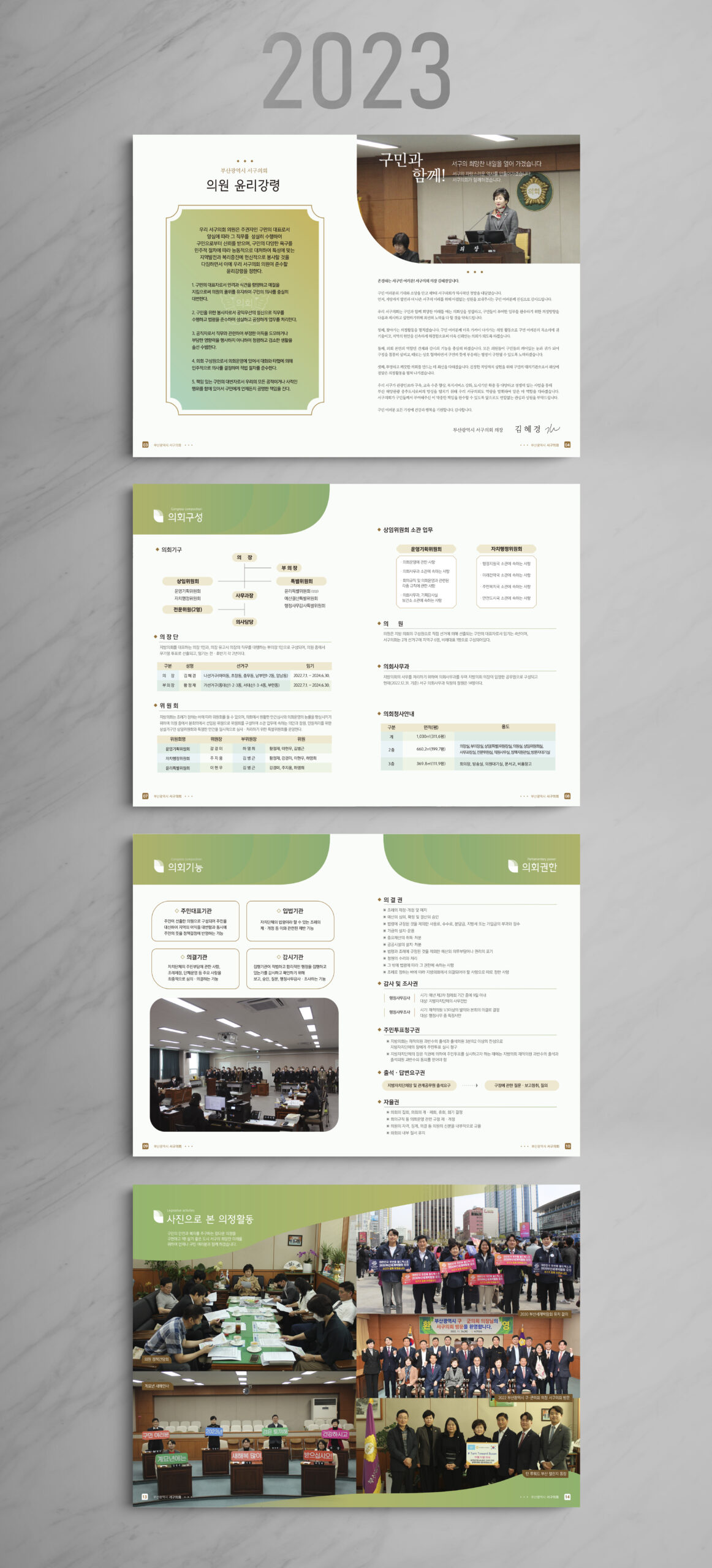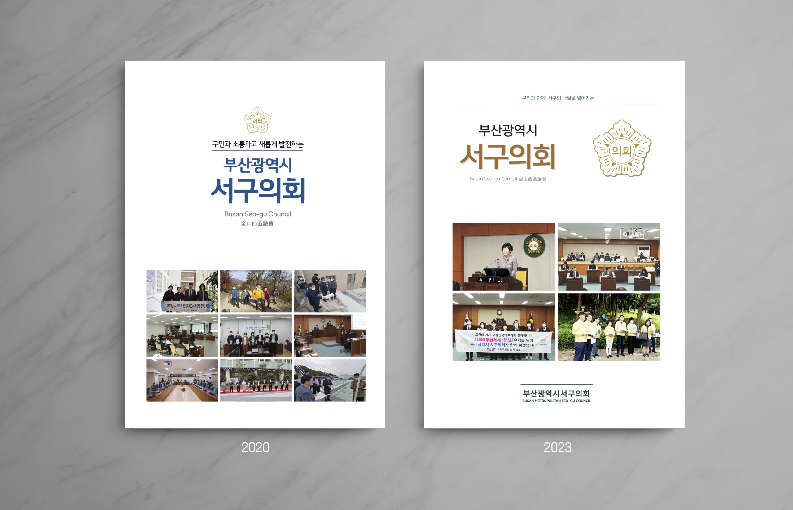 부산 서구청 서구의회 책자 디자인 • • • • 서구의회 2020년 2023년 부산광역시 서구의회 운영, 의정활동 괸련 책자 작업에 참여하였다. 활동 내용 특성상 내용이 많은 작업이라 가독성 높은 서체를 사용하고 레이아웃 또한 가독성과 판독성을 높이는 방향으로 작업을 진행하였다.