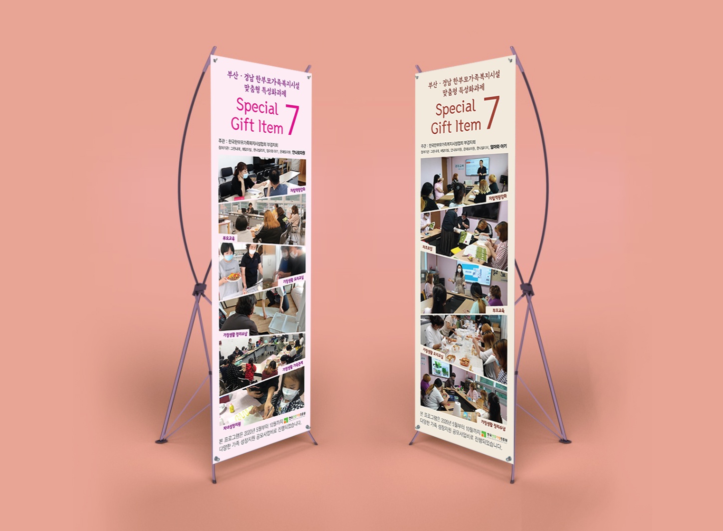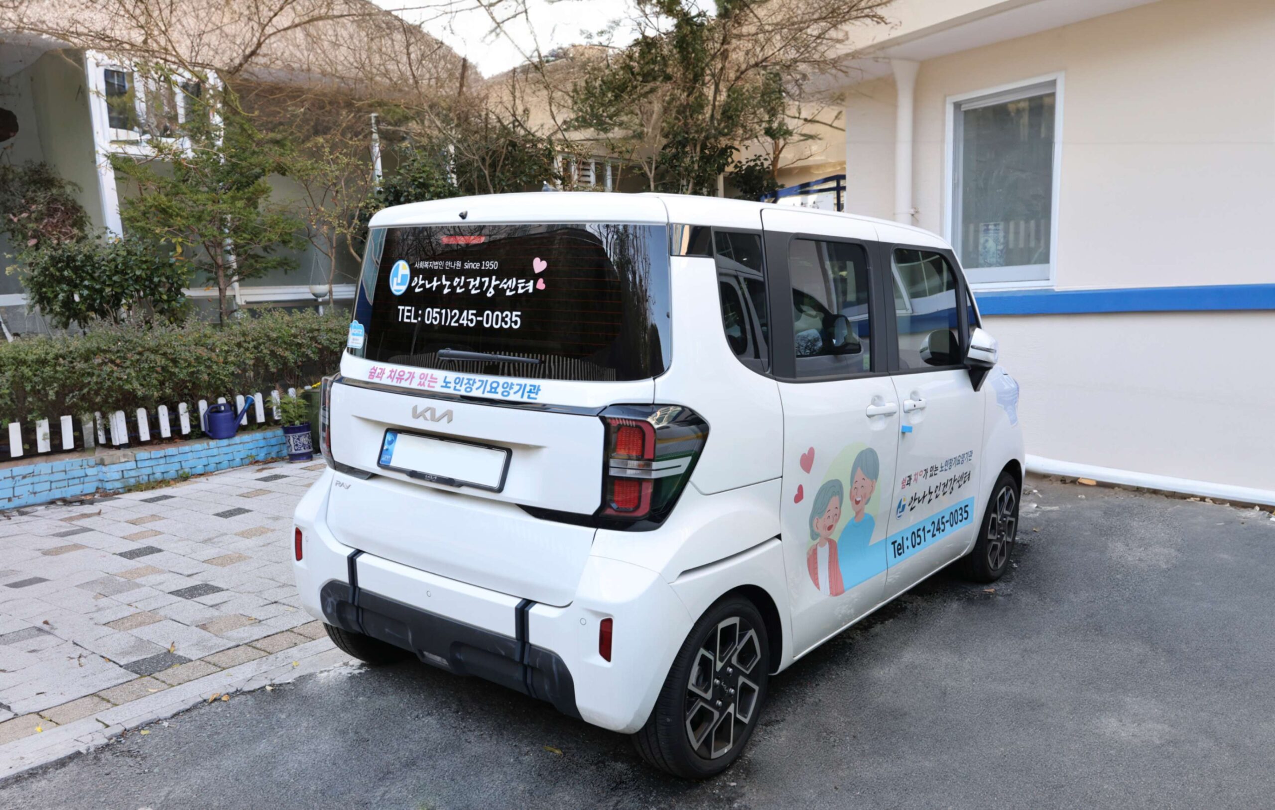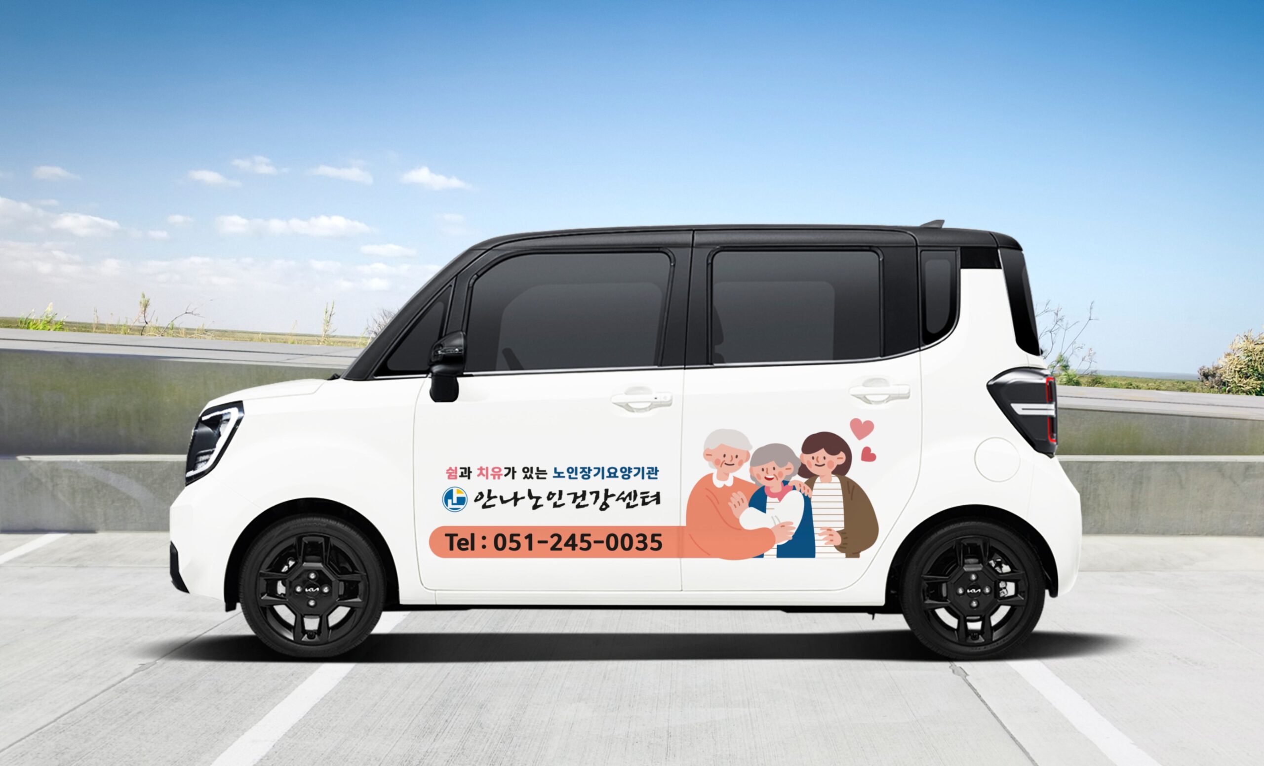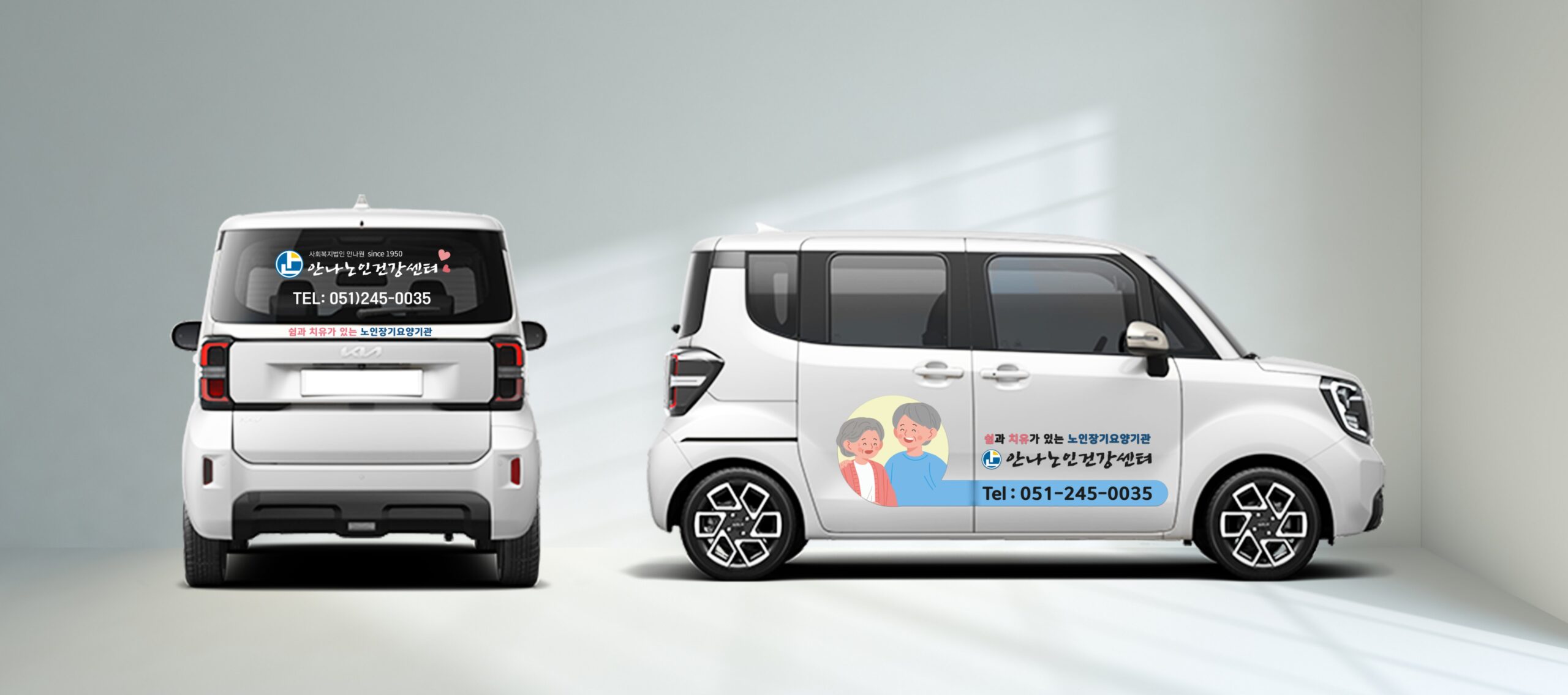 차량 랩핑은 보호를 필요로 하는 노인들에게 따뜻한 가정적 분위기를 조성하고, 청결하고 안정적인 서비스를 제공하는 이미지를 주기 위해 파스텔 살구색 컬러와 하늘색을 사용하고 함께하는 일러스트 이미지를 추가하였다. 명함은 한지공예 꽃 이미지를 사용하여 따뜻한 감성을 더해보았다.