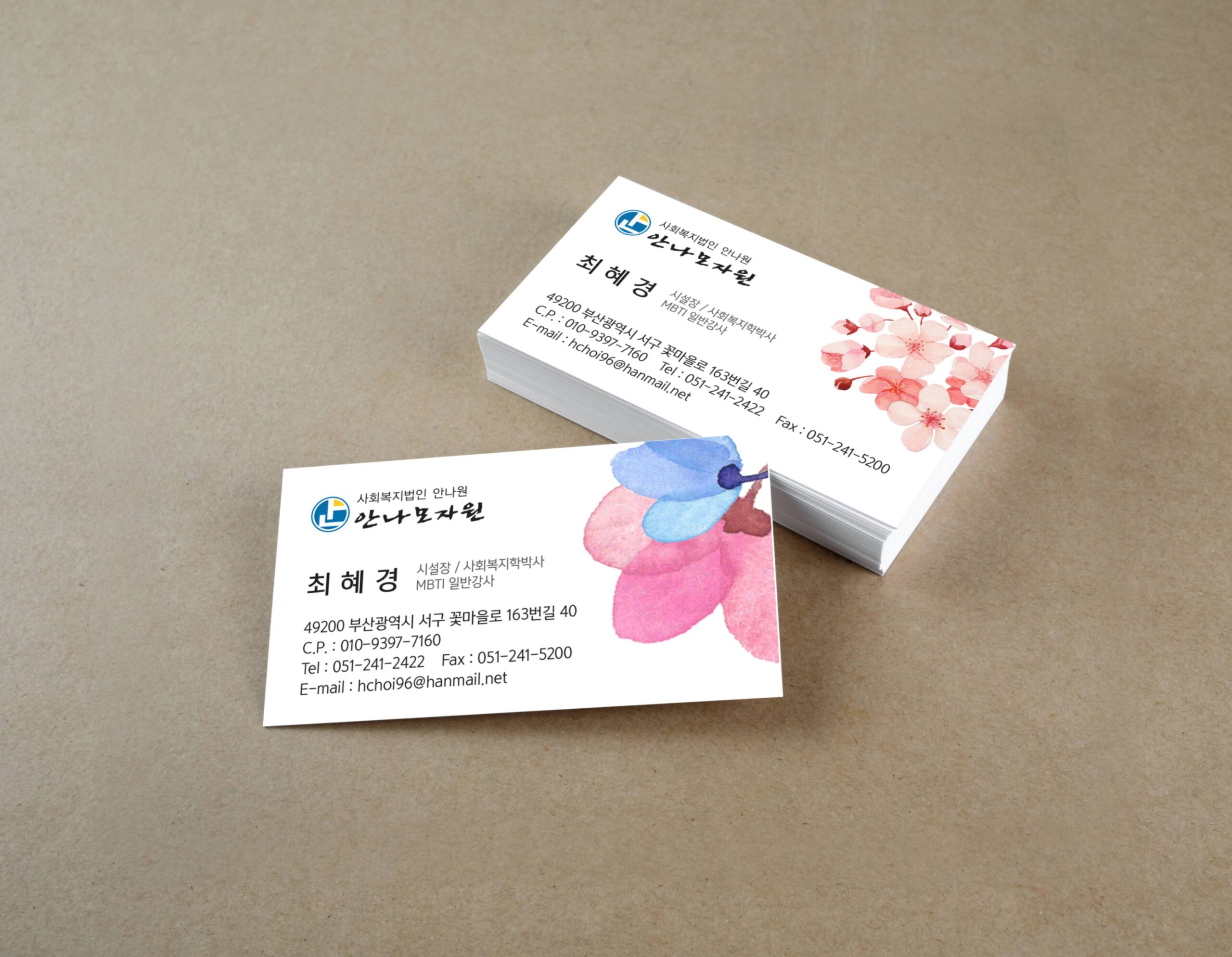 안나원이 운영하는 안나노인건강센터의 차량 랩핑 작업과 안나모자원의 명함, 배너 등을 제작하였다.