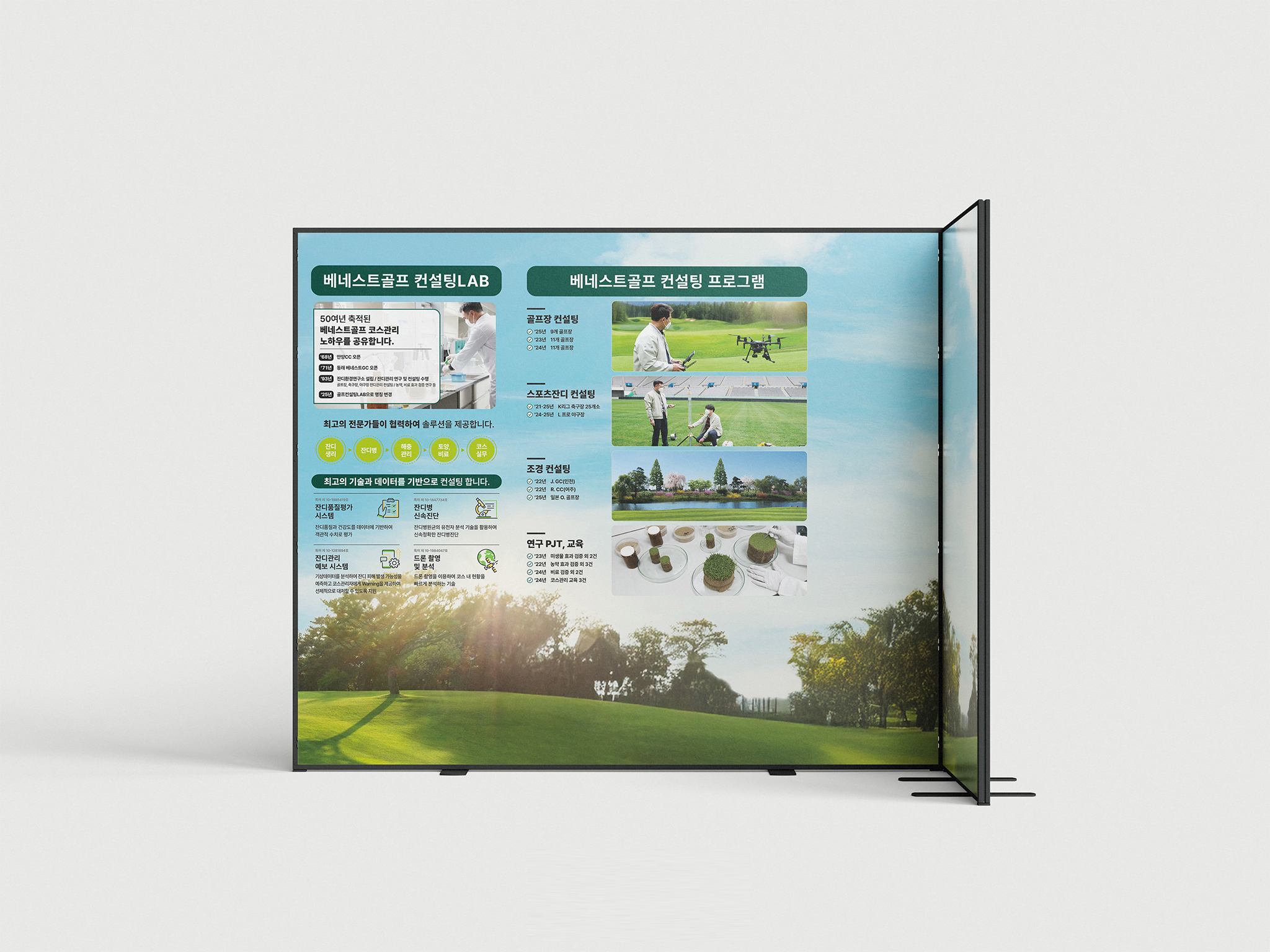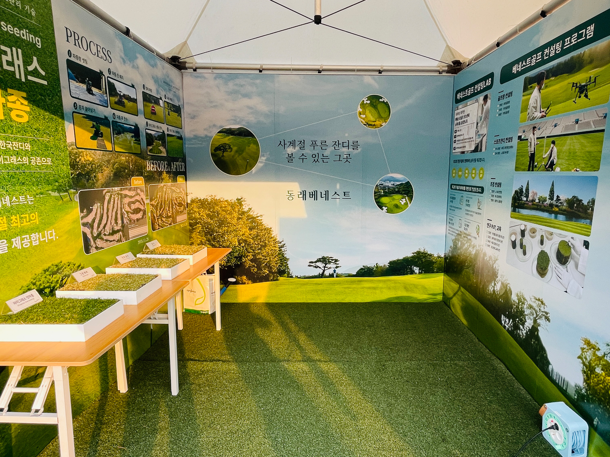 부스 운영 목적인 잔디의 푸르름과 파릇함을 극대화하고자, 전체 배경에 푸른 하늘과 잔디 이미지를 사용하였다. 정보와 타이틀은 1m 테이블 설치를 고려하여 방문객 눈높이인 상단에 전략적으로 배치하여 정보 전달력을 높였다. 현장에 인조 잔디를 깔아 고객들이 싱그러움을 직접 경험하게 하여 긍정적인 반응을 유도하였다.