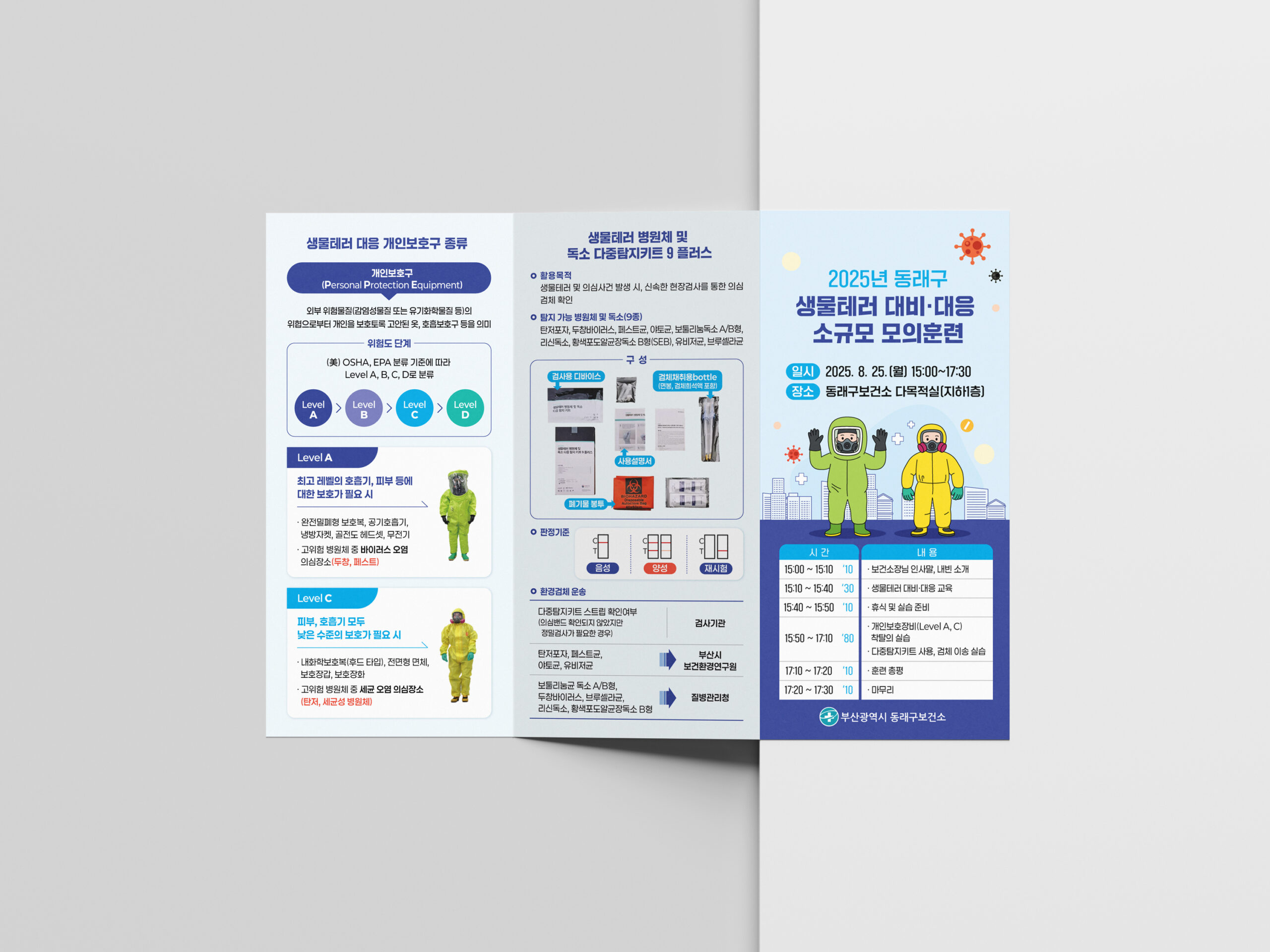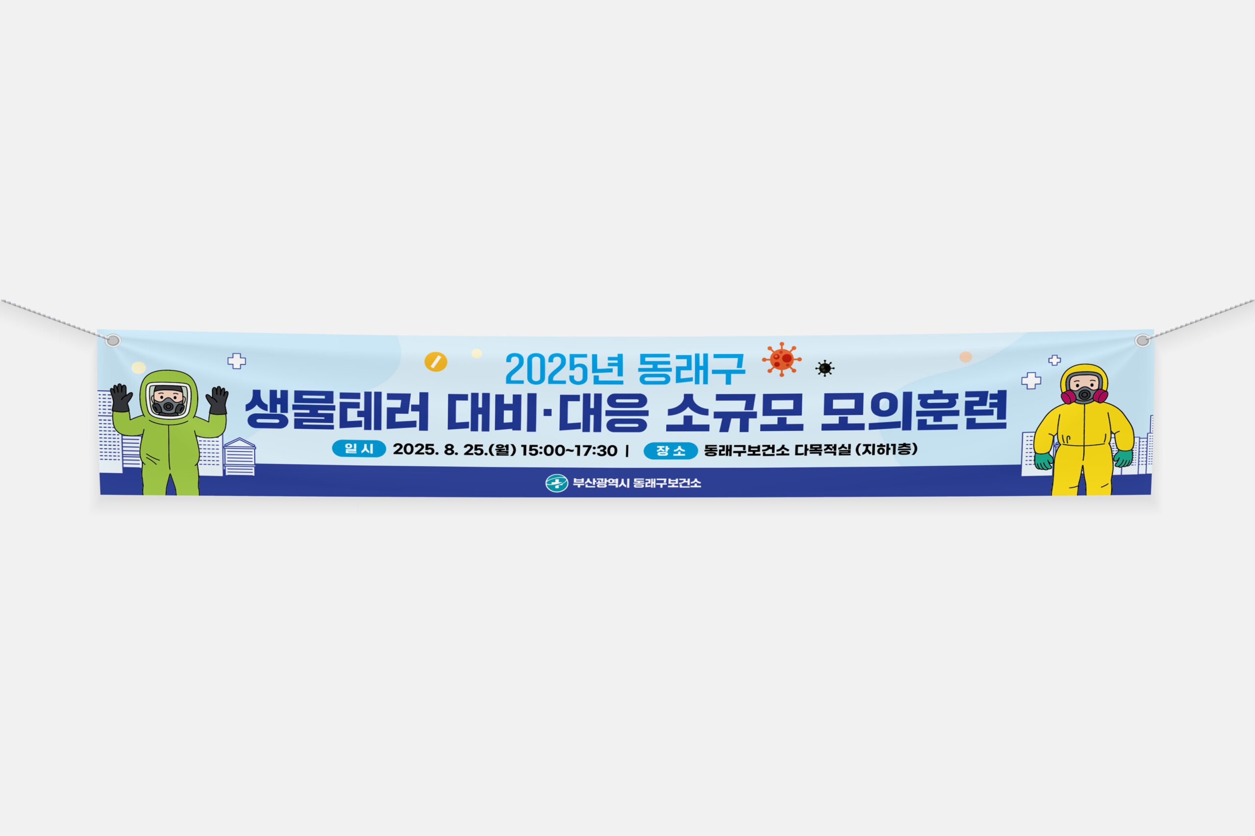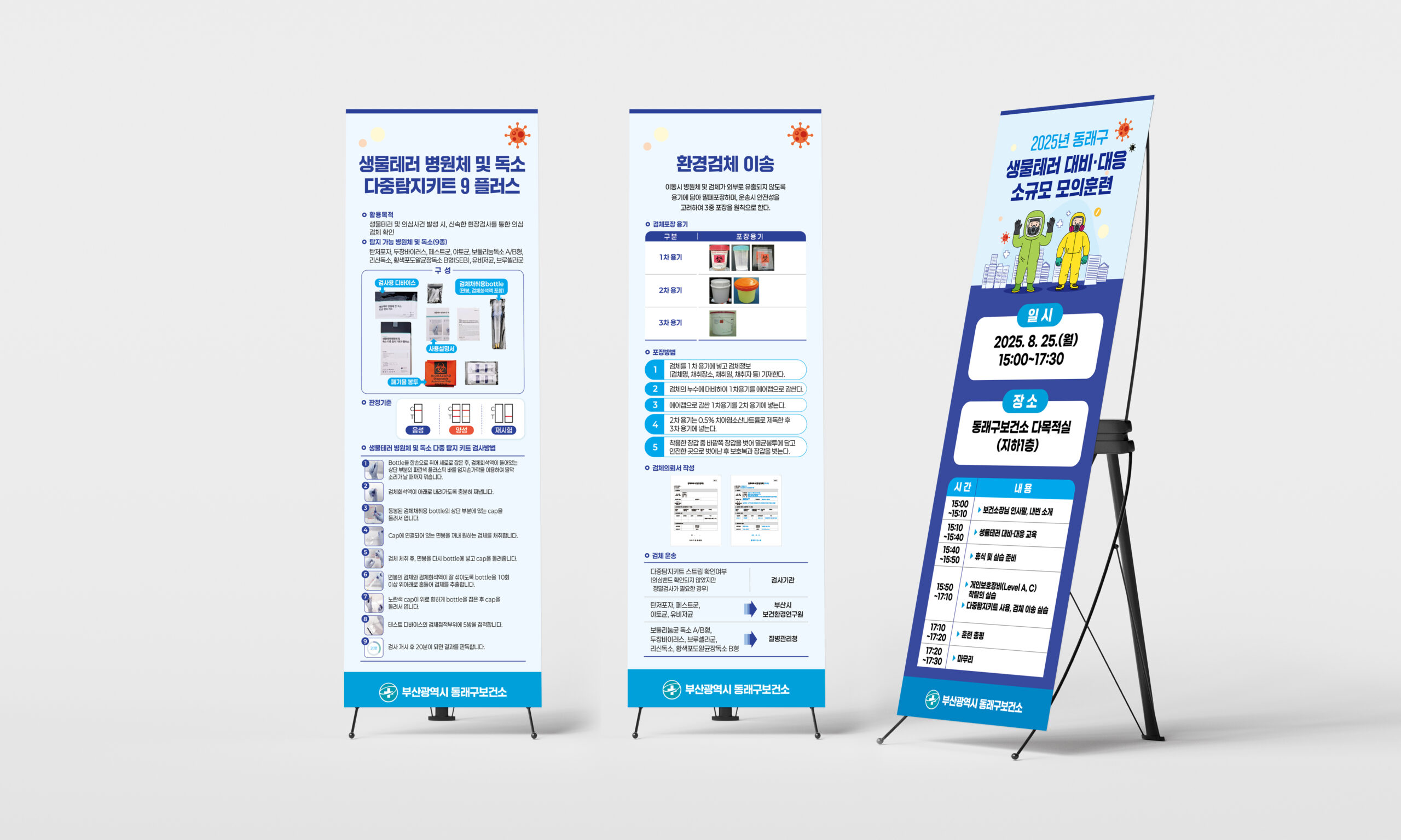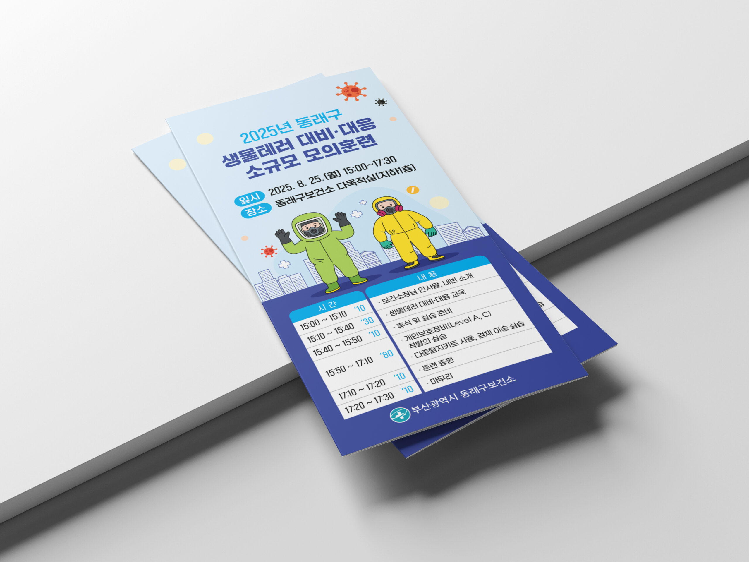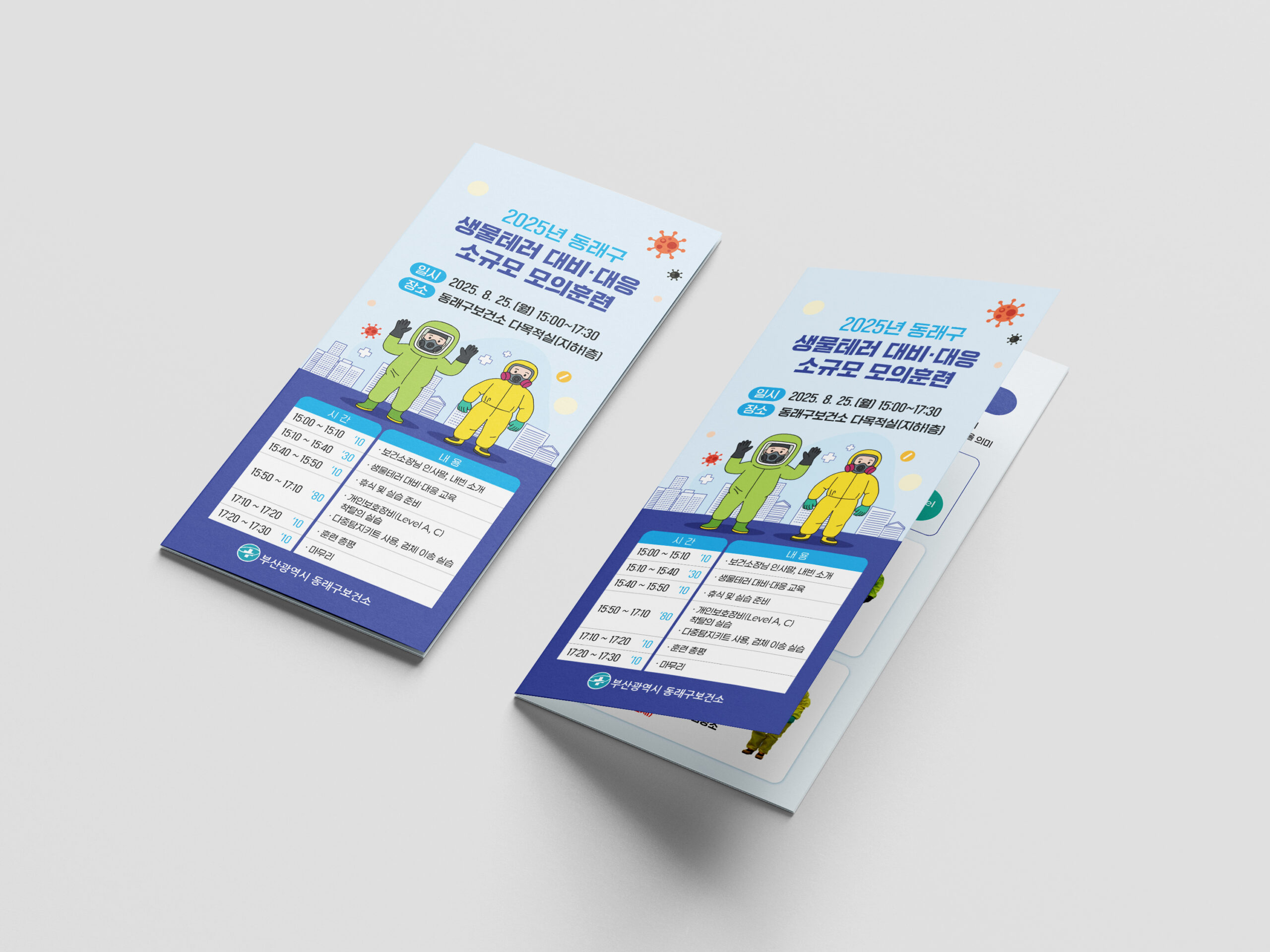 부산광역시 동래구보건소는 지역 내 생물테러 발생 시 신속하고 체계적으로 대응하기 위해 정기적인 모의훈련을 실시하고 있다. 의뢰는 훈련 내용을 효과적으로 전달할 홍보물 제작로, 리플릿, X배너, 현수막 등 행사에 필요한 모든 인쇄물을 통합 디자인하여 현장에서 바로 활용할 수 있도록 완성하였다.