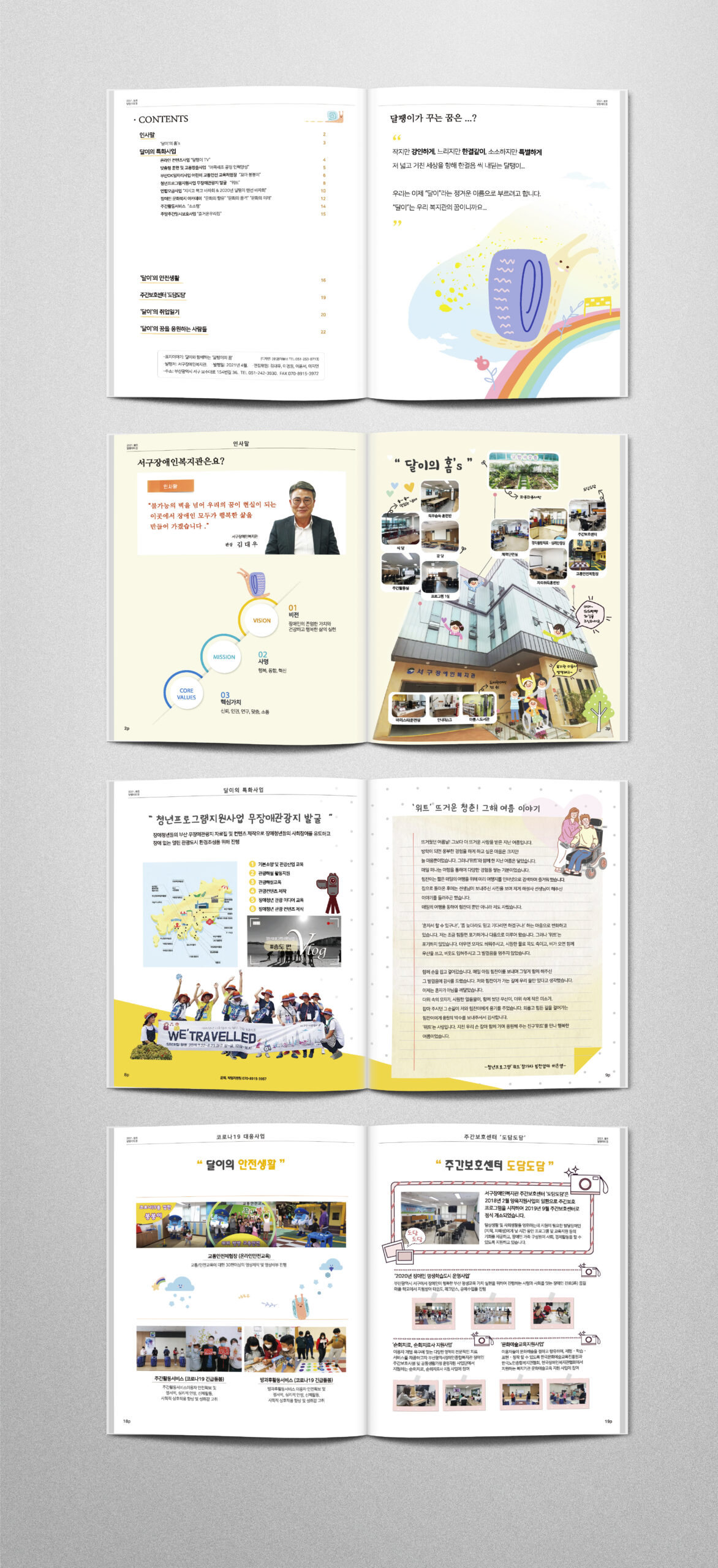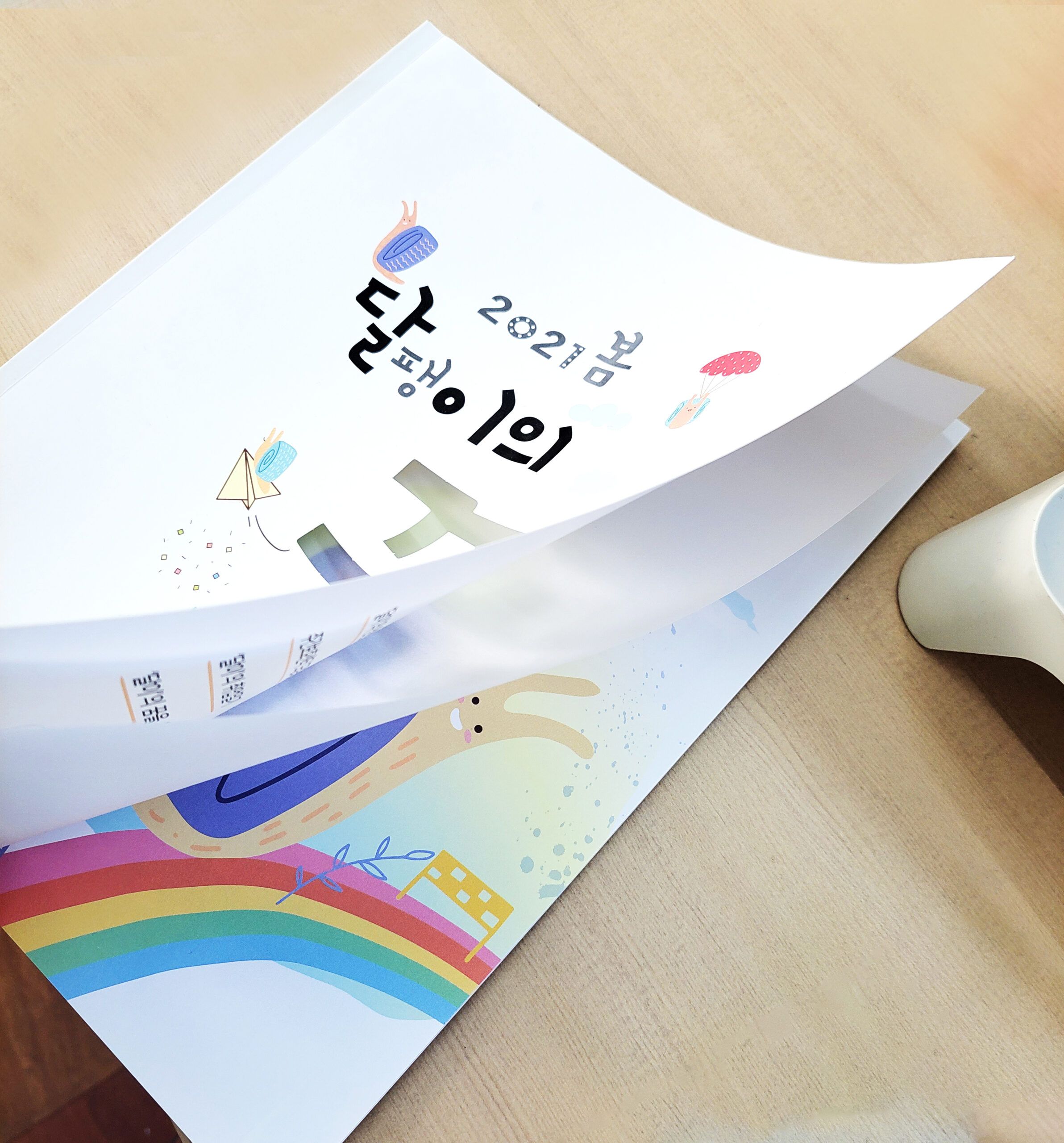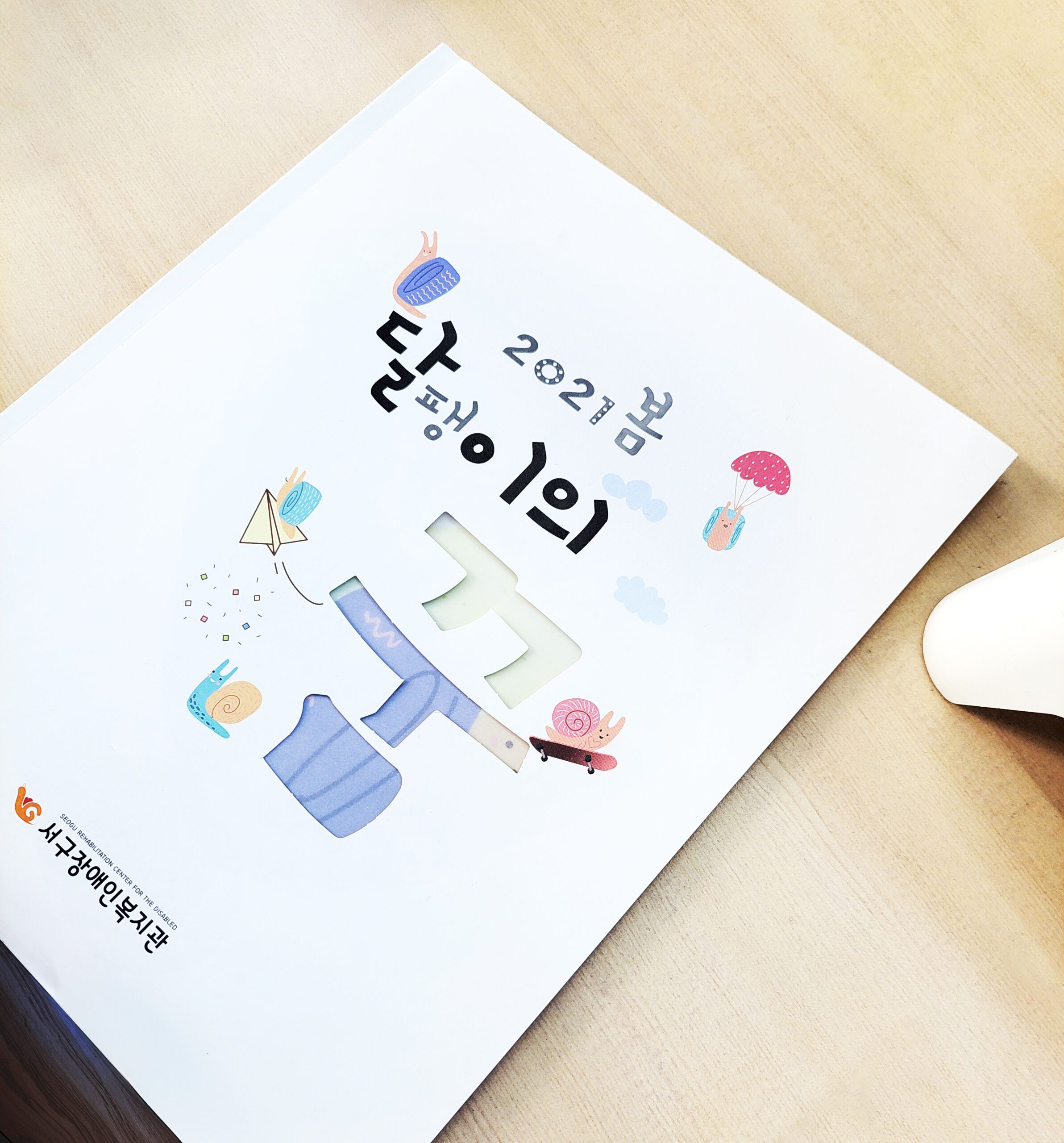 서구장애인복지관 – 달팽이의 꿈 • • • • 2021년 봄호 달팽이의 꿈 책자 표지 글에 형압을 적용하여 입체감을 주었고, 꿈을 강조하면서 즐거움을 주기위해 톰슨(도무송) 작업을 추가하였다. 트레싱지 면지를 추가하여 고급스러움을 더했다.
