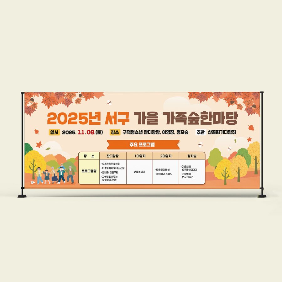 부산 서구청은 지역 주민 참여 확대와 가족 단위 체험 프로그램 활성화를 위한 ‘2025 서구 가을 가족숲한마당’ 행사디자인을 의뢰했다. 이번 행사디자인은 행사장 안내 체계 구축과 세대 공감형 메시지 전달이 주요 과제로 부산·울산·경남 기반 디자인 전문회사 디로드는 공공행사 홍보물 제작의 전문성을 바탕으로 대형 현수막과 체험구역별 X배너 디자인을 진행하였다.