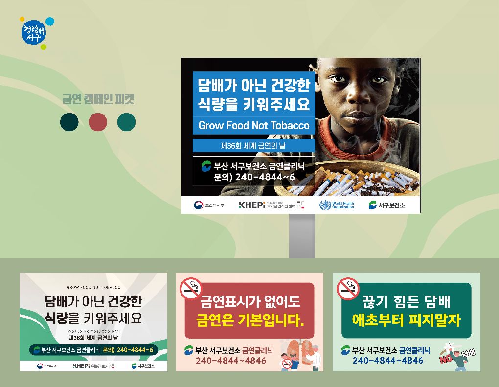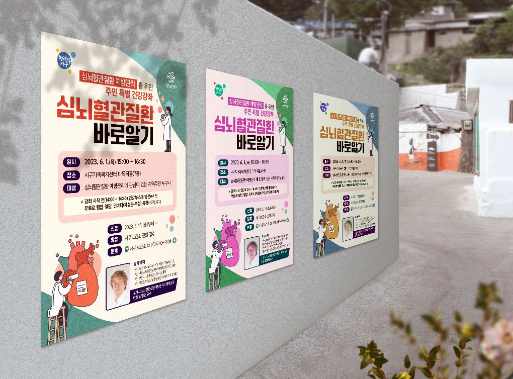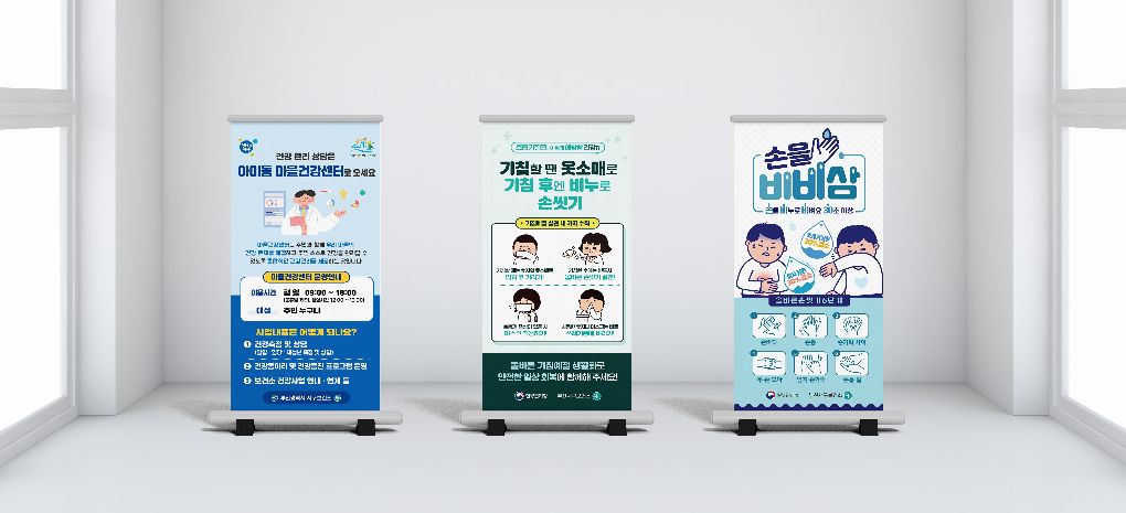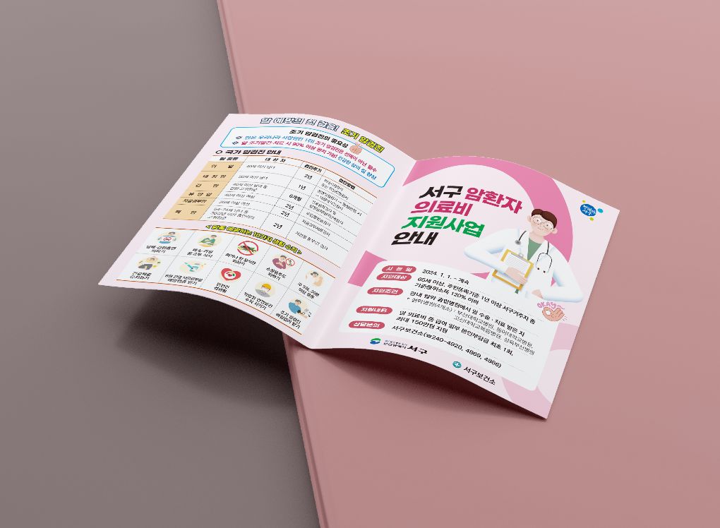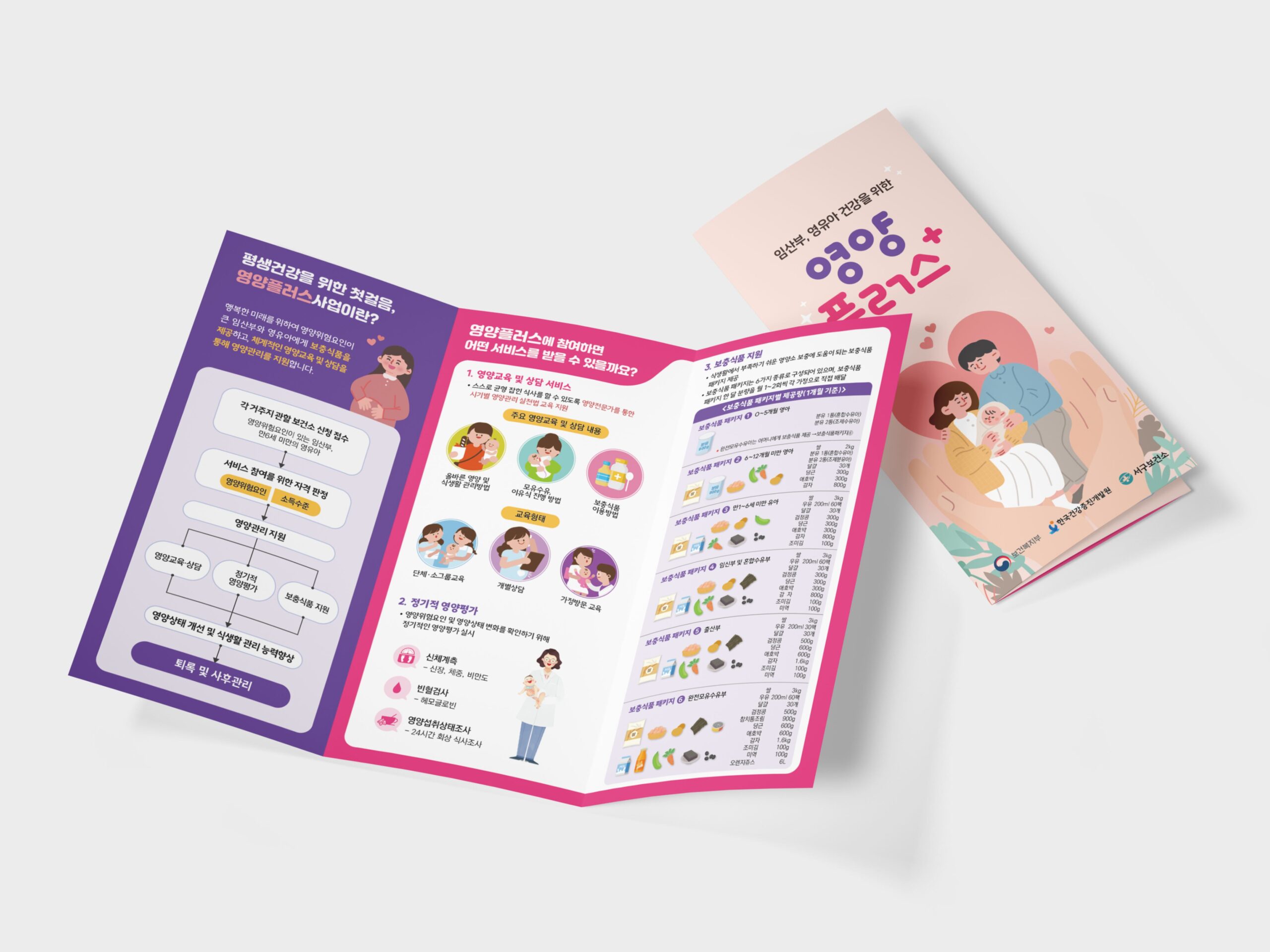 매년 서구 보건소 관련 행사에 맞는 각종 제작물 작업에 참여하고 있다. 미니 X-배너, 포스터, 전단지, 피켓, 현수막 작업 등을 제작하였다. 임산부와 영유아 건강을 위한 영양플러스 3단접지 리플릿은 대상과 어울리는 부부와 아기 일러스트를 표지 이미지로 사용하였고 분홍색과 보라색 계열을 사용해 디잔인하였다. 리플릿 내지 부분은 배경색을 사용해 카테고리 별로 내용을 묶어주어 정보 파악이 용이하도록 작업하였다.