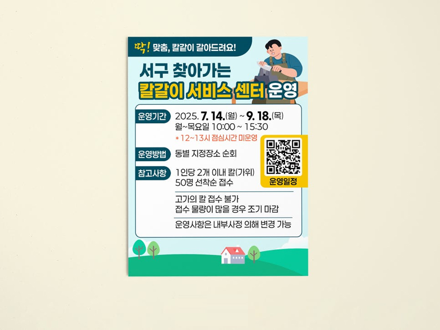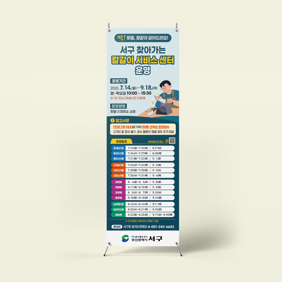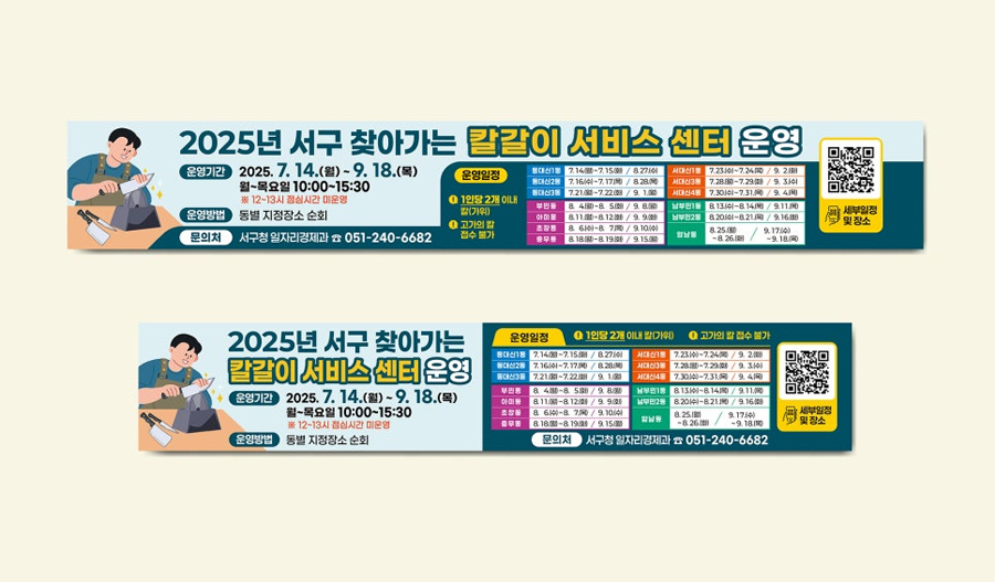 서구 일자리경제과는 주민 생활 편의를 위한 ‘서구 찾아가는 칼갈이 서비스센터’ 운영 홍보를 위해 디로드에 홍보물 디자인을 의뢰하였다. 디로드는 홈페이지 게시용 웹배너, 실내외 X배너, 거리 홍보용 현수막, 실내 현수막 등 다양한 매체에 적용되는 홍보물을 통합적으로 디자인하였다. 이번 홍보물은 공공기관 사업의 특성을 고려해 누구나 편안하게 받아들일 수 있는 친근한 이미지를 중심으로 구성하고 일러스트를 활용하여 어린이와 노인을 포함한 전 연령층이 부담 없이 이해할 수 있도록 시각적 접근성을 높였다. 또한 밝고 안정적인 컬러를 적용해 공공서비스의 신뢰감과 친근함을 동시에 전달하였다.