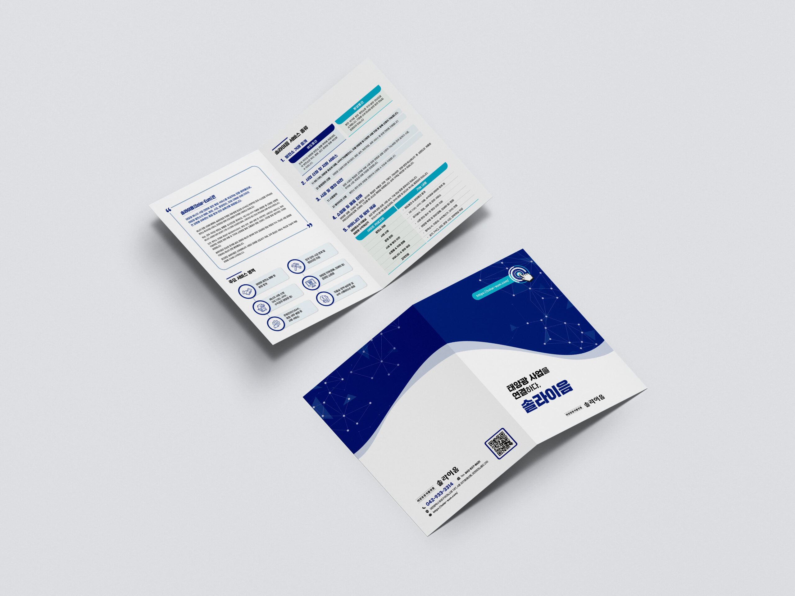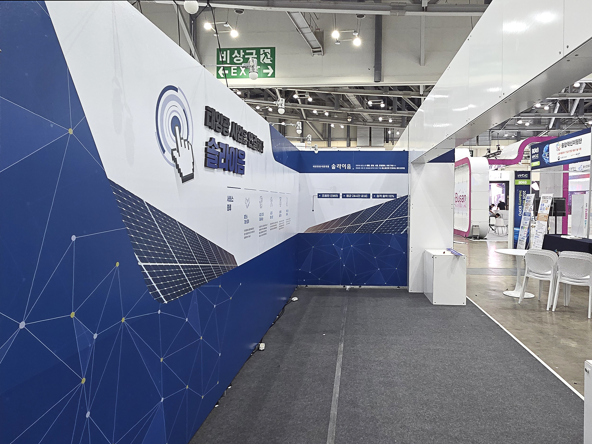 작업은 부스 백월 디자인을 중심으로 테이블보, POP, 기업 브로슈어 제작과 현장 설치 시공까지 원스톱으로 진행됐다. 솔라이음의 핵심 가치인 연결성과 원스톱 서비스를 명확히 전달하는 데 초점을 맞췄다. 청색을 메인 컬러로 사용해 기술적 전문성과 신뢰감을 강화했고, 점과 선을 연결한 패턴으로 플랫폼의 본질을 시각적으로 표현했다. 타이틀은 힘 있는 서체와 입체 구조로 구성해 브랜드 인지도를 높였다. 아이콘과 간결한 텍스트를 활용해 관람객이 짧은 시간 안에 서비스를 이해할 수 있도록 했다. 부스와 인쇄물 전반에 동일한 컬러와 패턴 시스템을 적용해 현장에서 통합된 브랜드 아이덴티티를 구현했다.