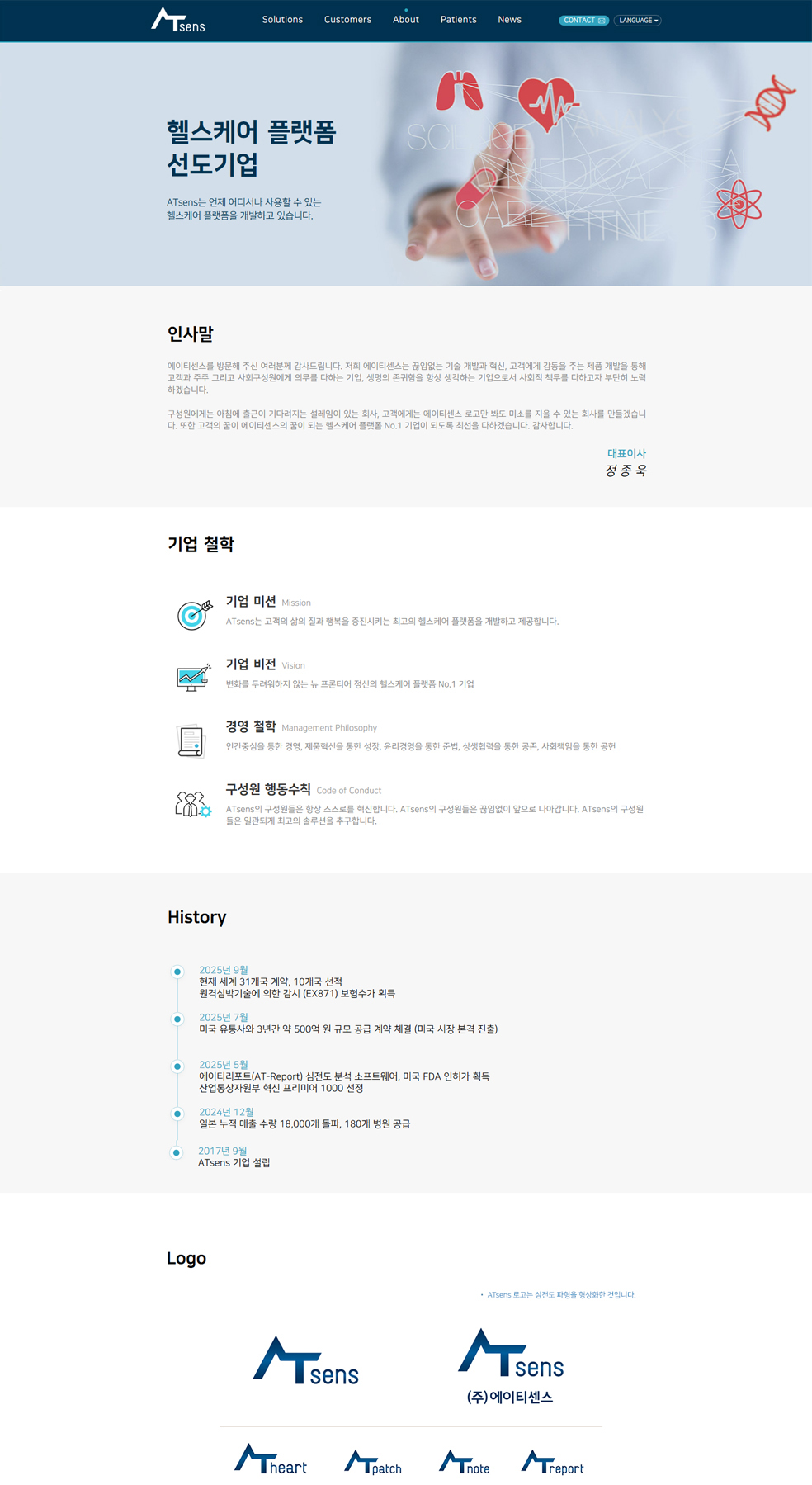 디자인사업부 디로드는 에이티센스의 첨단 기술력과 생명 존중의 가치를 담아 “신뢰를 잇는 정밀한 인터페이스”라는 컨셉으로 브랜드 웹사이트를 구축하였다. 의료기기 특유의 청결함과 신뢰감을 강조하기 위해 화이트와 딥 블루 컬러를 전략적으로 사용하였으며, 복잡한 임상 데이터와 제품 스펙을 직관적인 인포그래픽으로 시각화하여 정보 전달의 명확성을 확보하였다. 또한, 제품의 슬림한 디자인 아이덴티티를 반영한 미니멀한 레이아웃과 매끄러운 스크롤 애니메이션을 통해 혁신적인 사용자 경험을 선사한다.