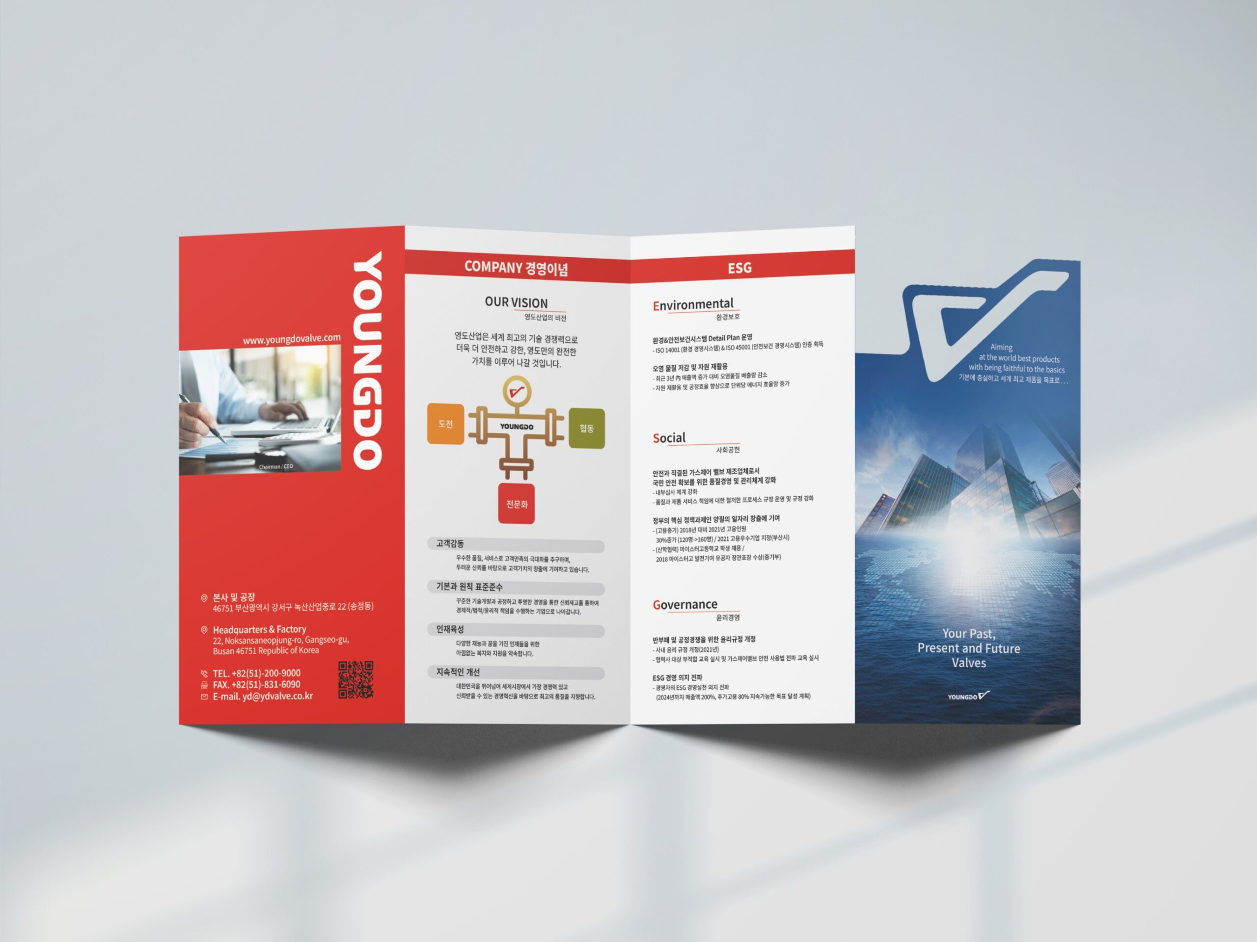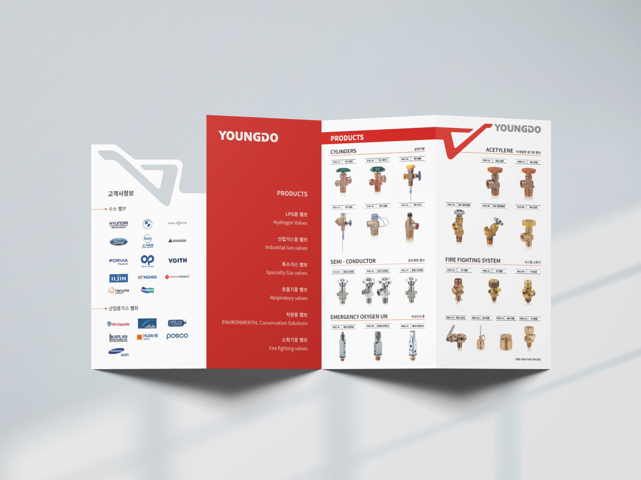 영도산업(주)는 각종 가스 용기용밸브를 제조하는 업체로써 ISO9001 및 UL을 획득하여 31년간 축적된 기술로 국내 뿐만 아니라 전세계로 제품을 수출하고 있는 수출유망 벤처기업이다. 영도산업은 그 동안 축적된 가스 실린더 밸브 생산의 노하우와 전문성을 바탕으로 다양한 제품을 공급하고 있기에 제품과 기업의 전문성에 주안점을 두고 샘플을 제작하였다. 메인 컬러는 영도산업의 CI 컬러를 사용하여 리플릿을 통해 기업의 컬러를 인식시키고자 하였다.