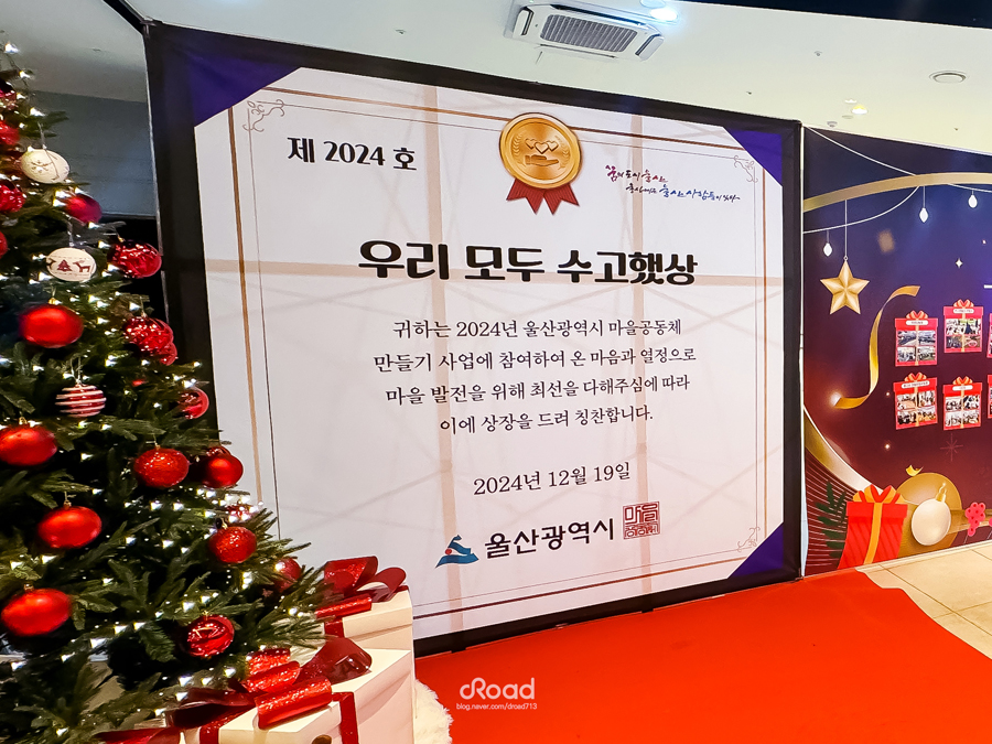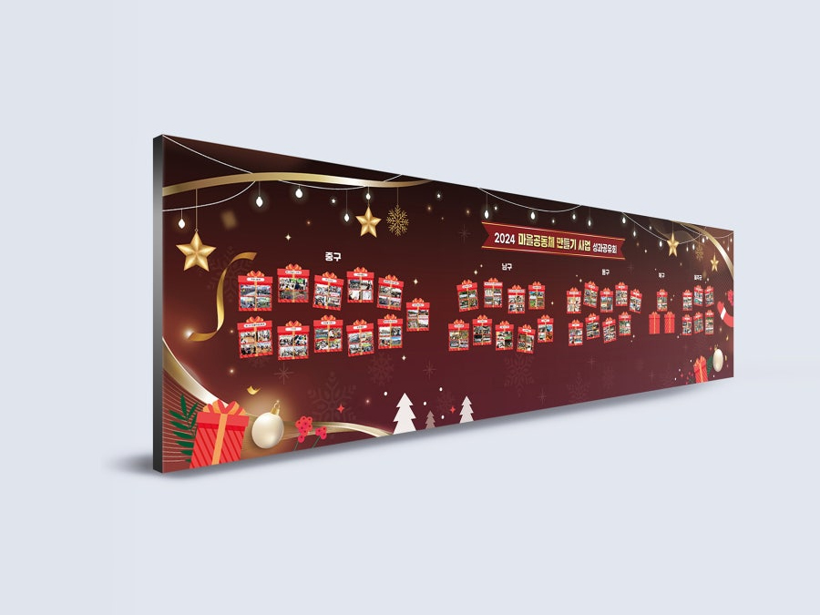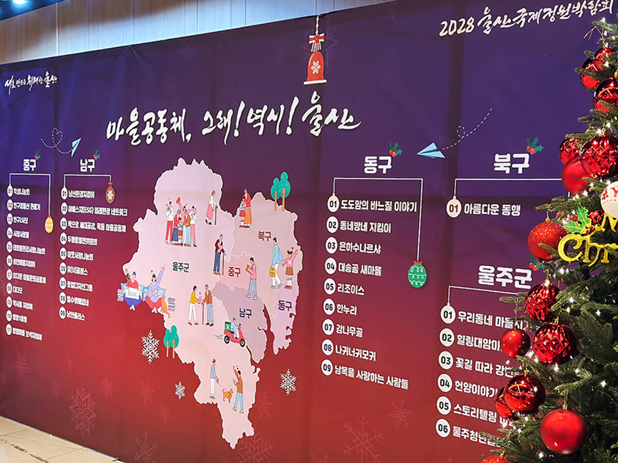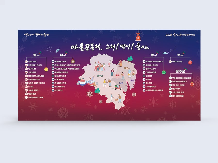 디자인은 울산 시정 컬러를 기조로 하되, 톤다운된 색감과 눈송이 오브제를 활용하여 차분한 연말 감성을 연출하고, 다양한 연령층의 캐릭터 일러스트와 3D 레이어 영상 편집 기법을 도입해 성과 공유의 몰입도를 극대화했다. 트러스 백월에는 시각적 가시성을 높인 금색 라인과 오너먼트 디자인을 적용했고, 울산 지도 기반의 공동체 일러스트를 배치하여 행정 구역별 활동 거점을 명확히 시각화했다. 그 결과 공공기관의 행정적 목적에 부합하는 고품격 행사 공간을 완성했다.