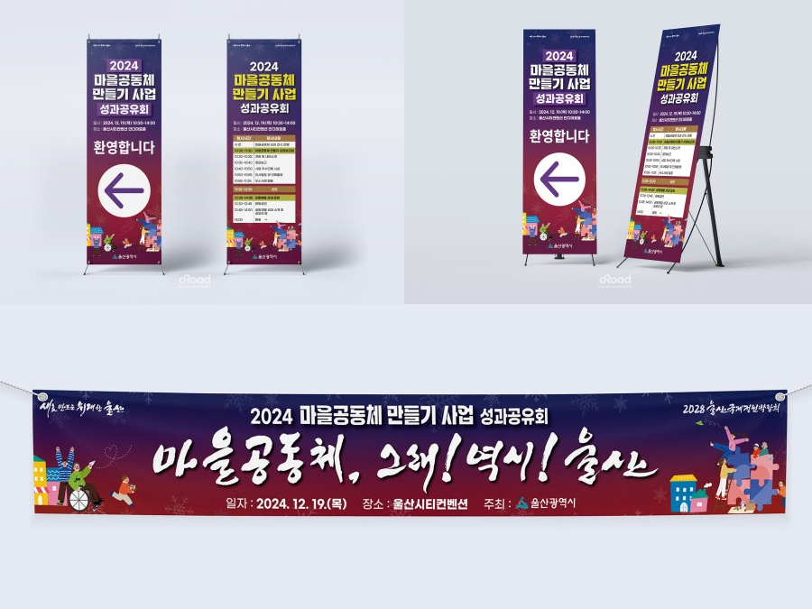 울산희망공작소는 공공디자인 전문성을 갖춘 디로드에 마을공동체 성과공유회 행사의 디자인, 제작, 설치와 철거 등 토탈 솔루션을 의뢰하였다.