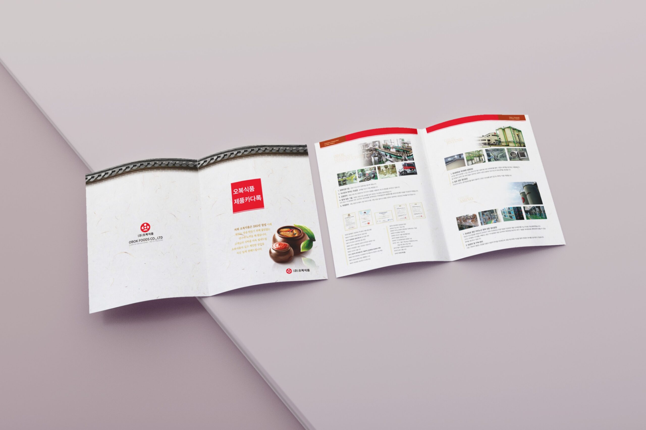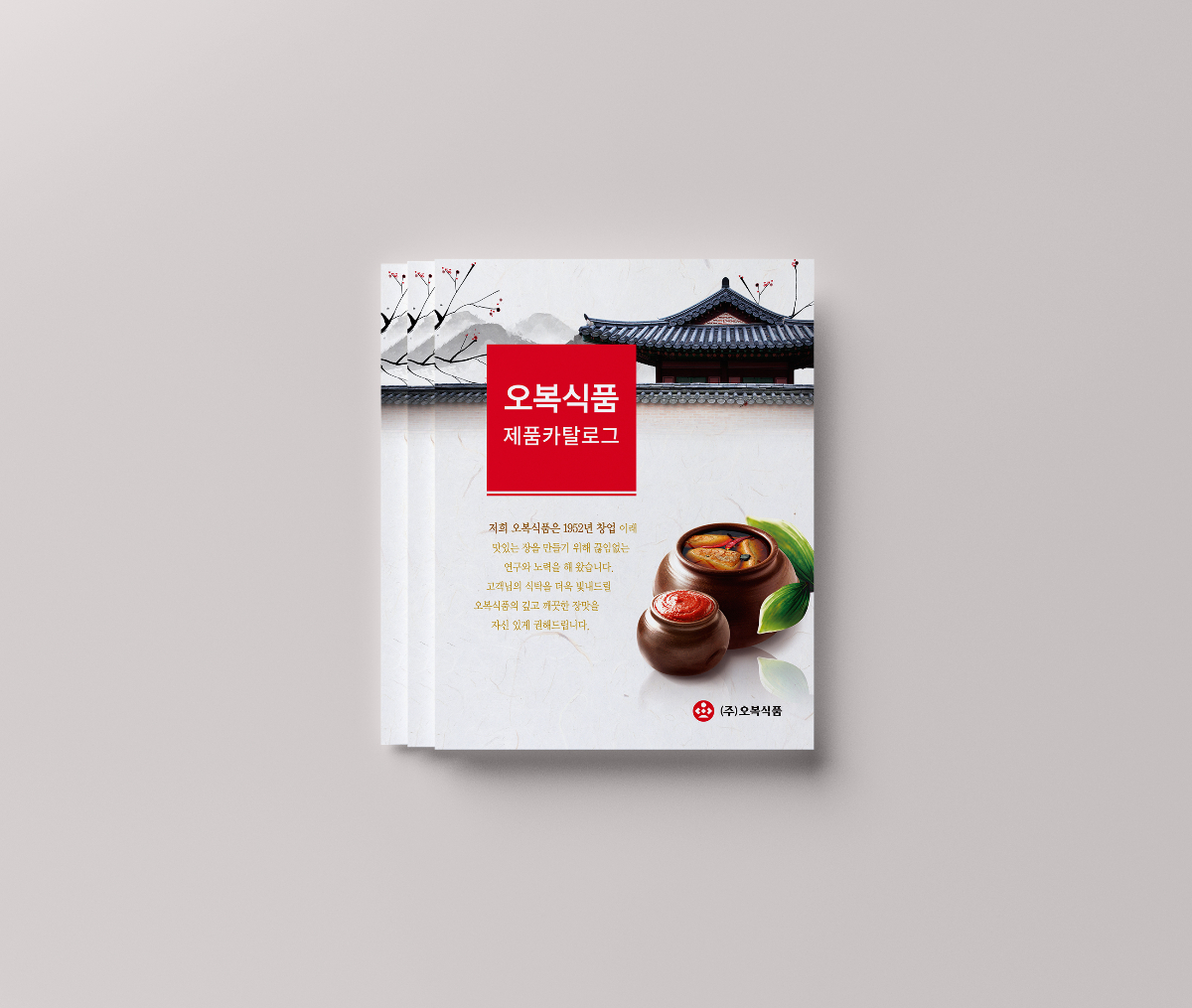 70여년 전통의 장류 전문 기업 – (주)오복식품 카탈로그 작업 • • • • 한옥은 전통 한국 건축 양식의 재래식 집을 말한다. 한옥 뒤켠의 장독대와 부엌살림들의 이미지는 자연스럽게 어머니의 손맛을 연상하고 전통 방식의 정성을 보여주는 요소이기도 하다. (주)오복식품은 오랜 전통 방식으로 어머니의 애정과 정성이 깃든 맛을 지키기 위해 노력하고 있다. 그러한 노력을 제품에 전달하기 위한 시각적 방향성을 제시하고자 하였다.