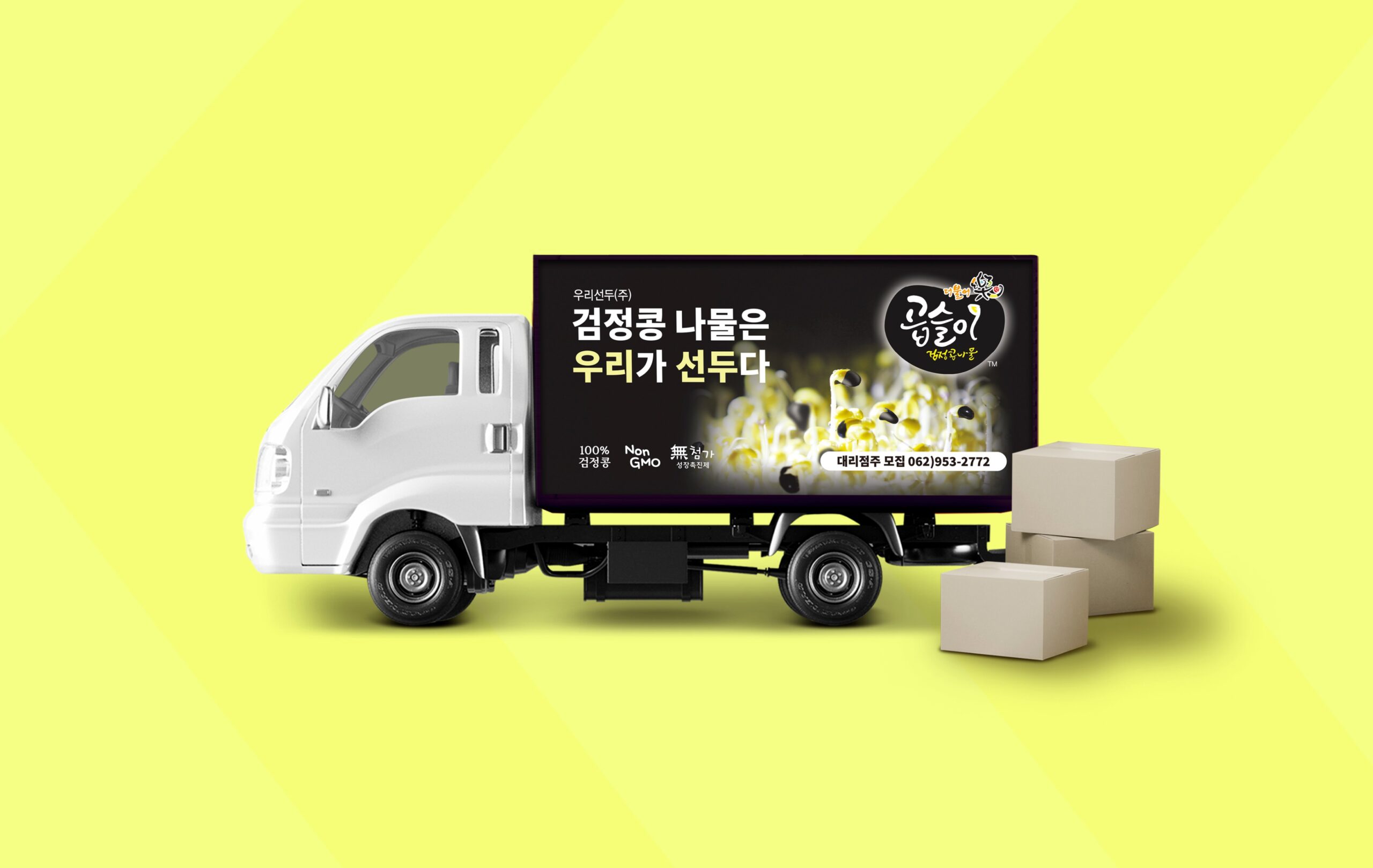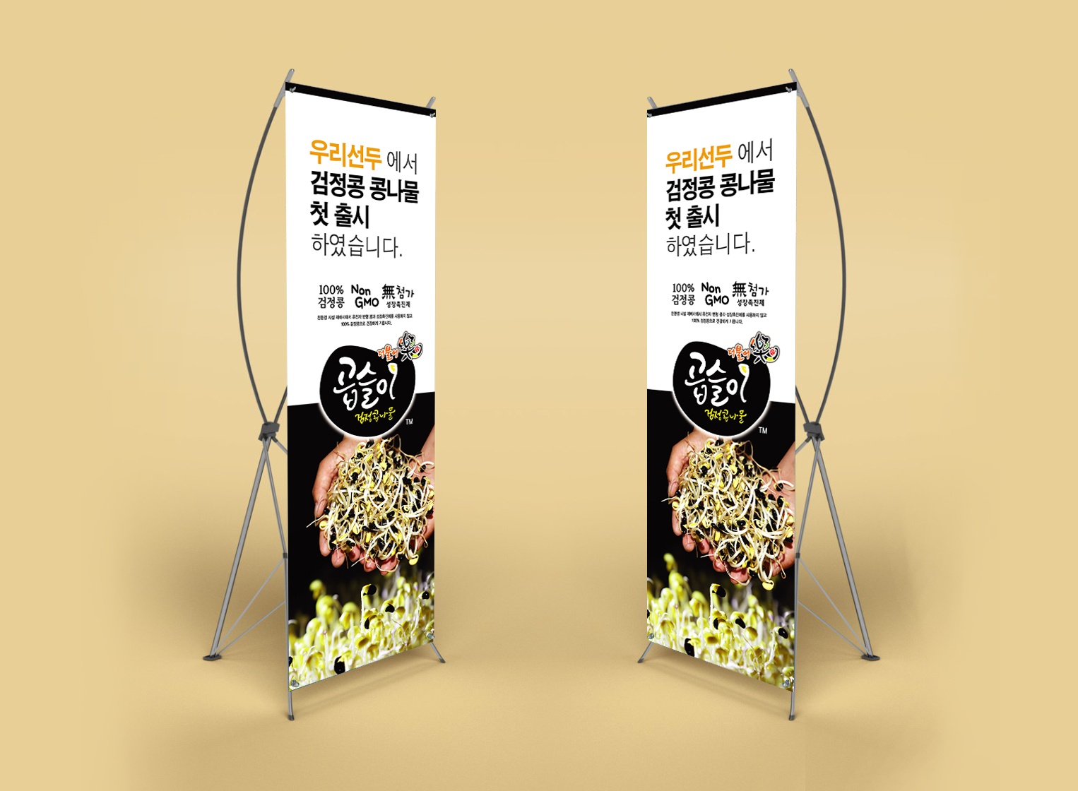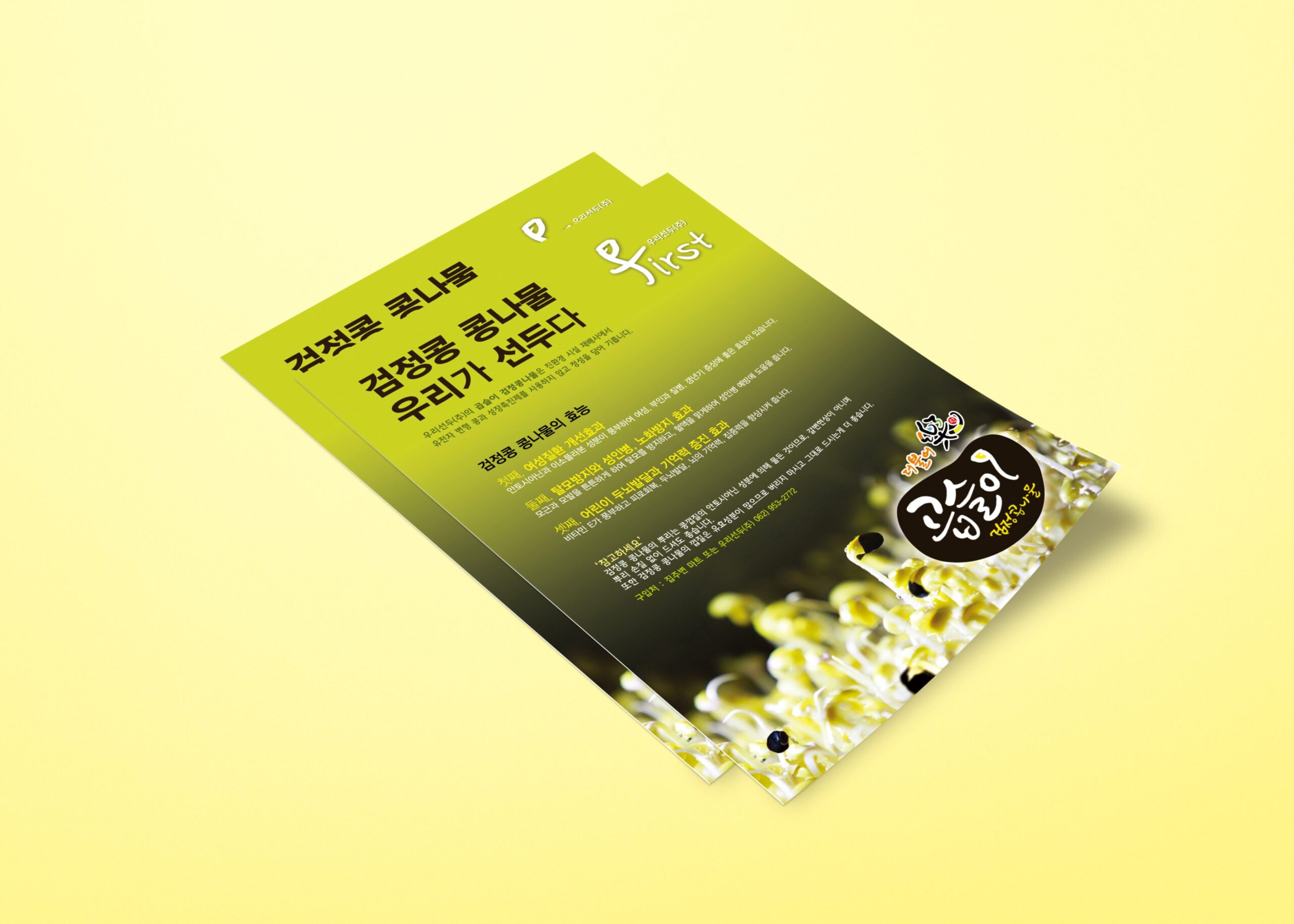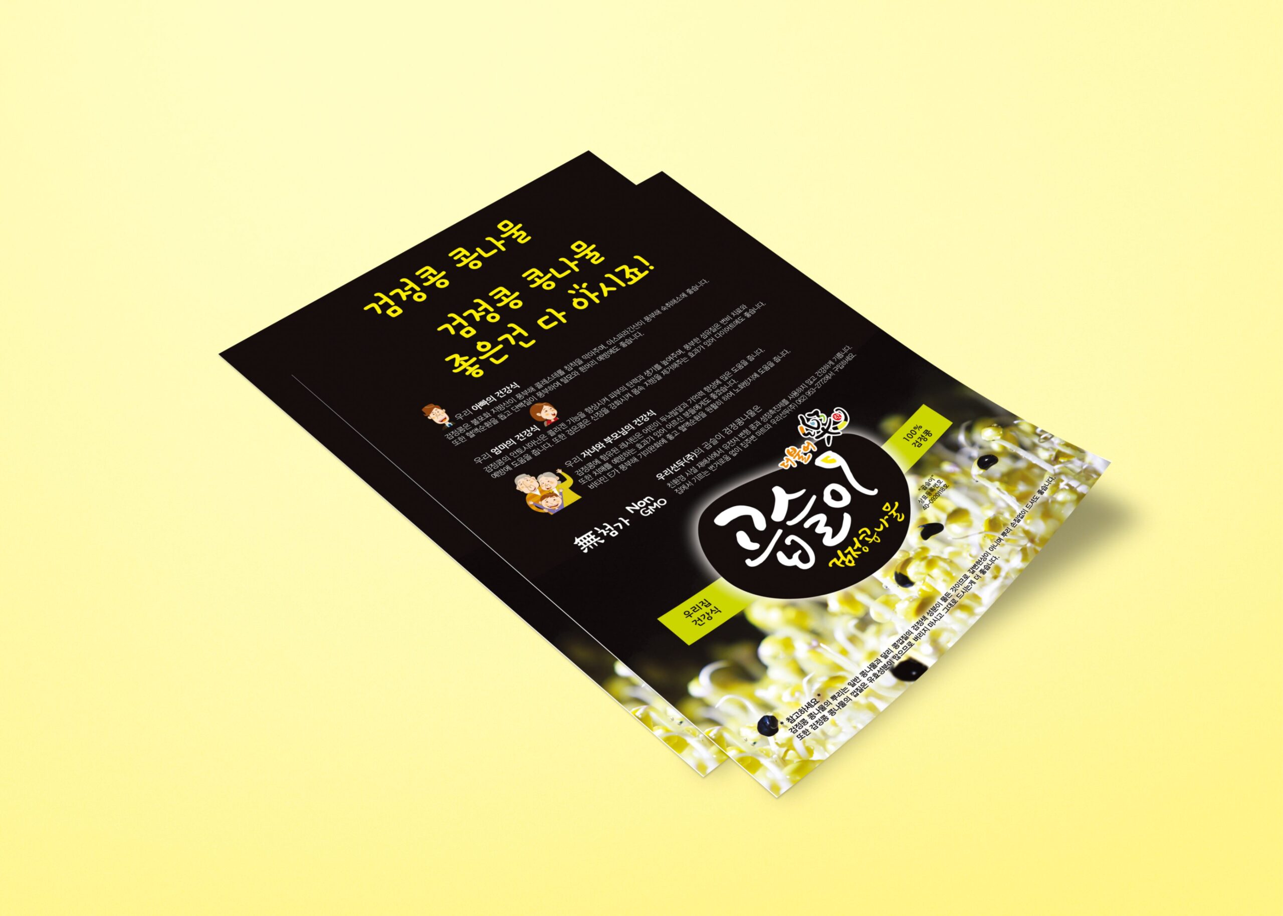 내 가족이 먹는 음식이라고 생각하고 깨끗한 곳에서 건강한 식재료만을 사용하는 (주)우리선두의 전단지, 차량광고랩핑, X배너 편집작업을 진행하였다. 검정콩나물의 건강한 먹거리 확대를 위한 홍보 작업에 참여하였다. 첫 출시 ‘검정콩’의 이미지를 강조하기 위해 검정 배경에 신선한 콩나물의 레몬 엘로 컬러를 포인트로 사용하였다.