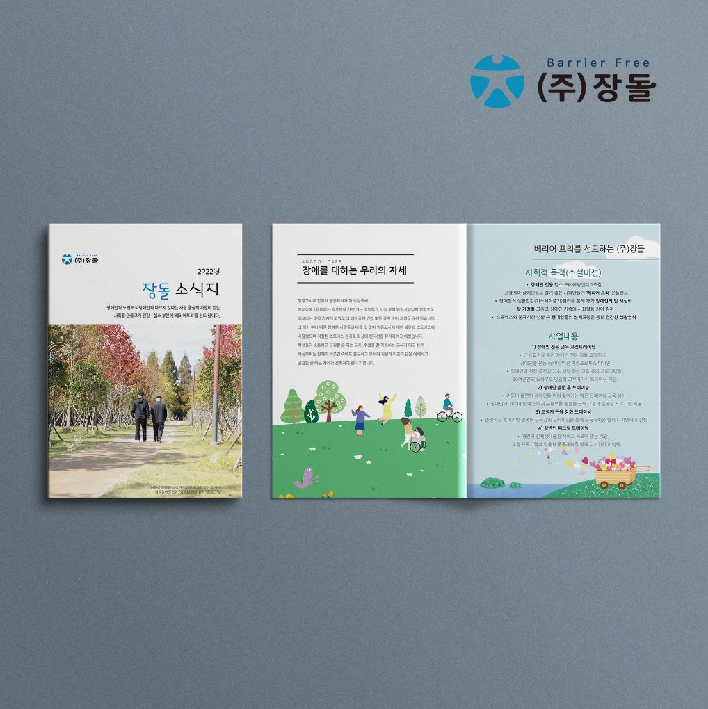 베리어 프리 주식화사 장애인 돌봄 – (주)장돌 • • • • 사람중심의 차별이 없는 사회만들고자 건강ㆍ헬스 부분에 ‘베리어프리’를 선도하는 장돌은 장돌의 ㅈ + 사람 형상을 의인화한 형태의 심볼로 구성되어 사람중심의 기업임을 직관적으로 보여준다. • • • • ‘베리어 프리’라는 슬로건으로 장애인과 비장애인의 차별과 마음의 벽을 허물기 위해 전체적으로 부드러운 느낌을 주었다.