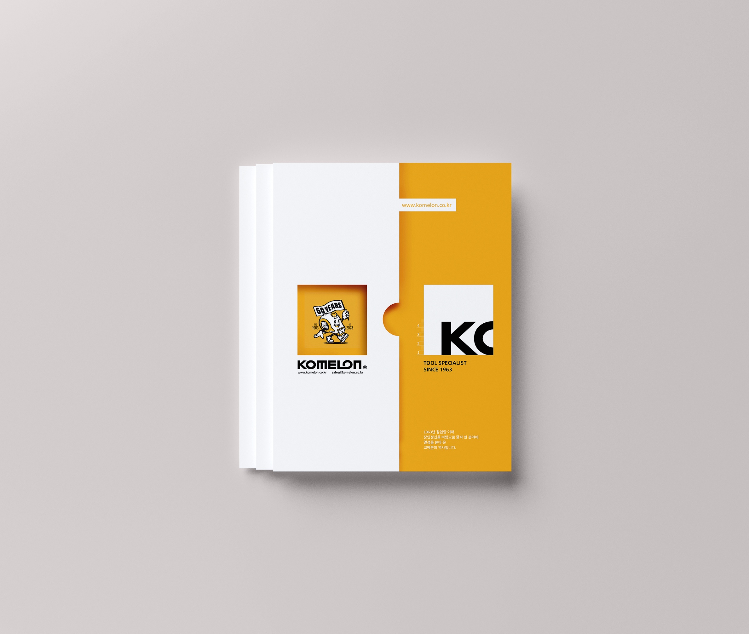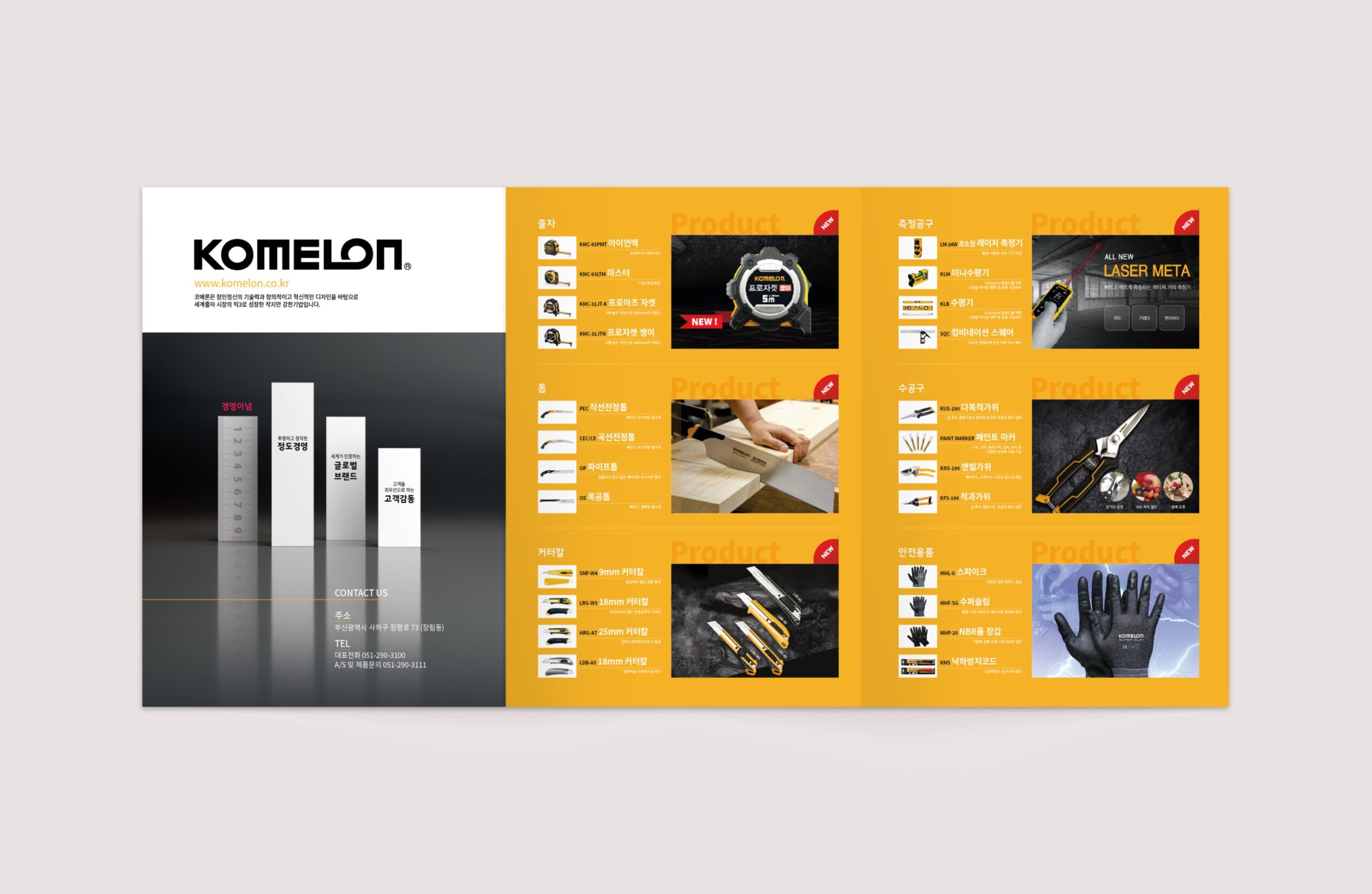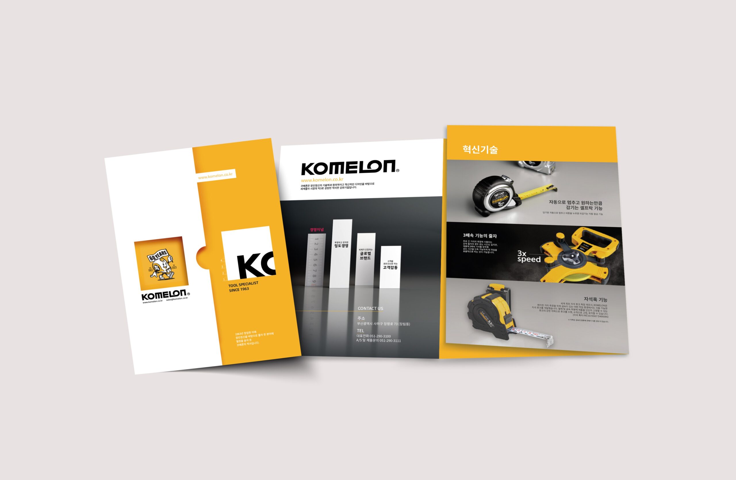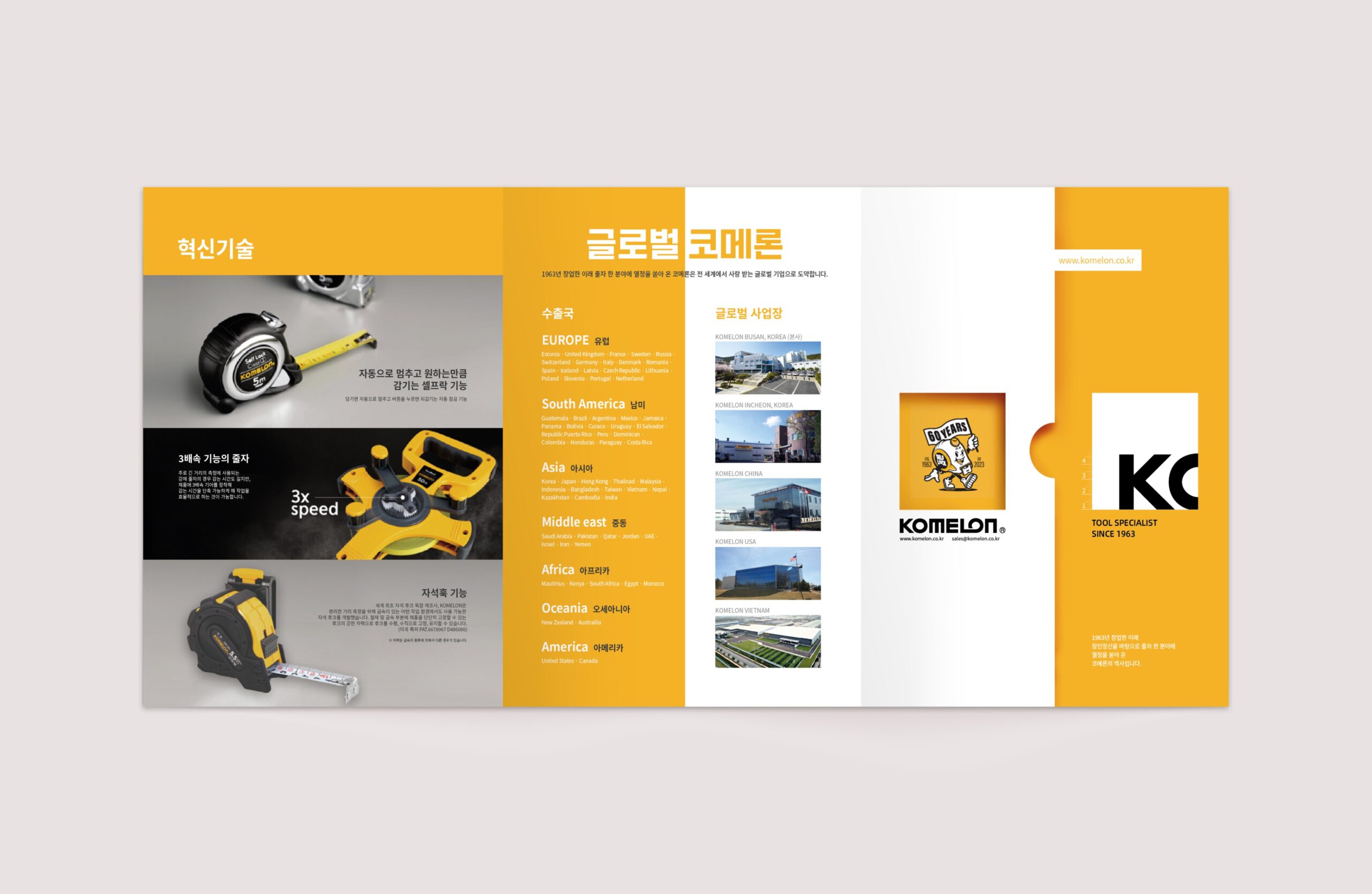 코메론 3단 리플릿은 전체 컬러를 코메론CI 컬러 Komelon Yellow와 Black을 사용하여 신제품과 혁신기술 제품을 쉽게 습득되도록 제작하였다. 대표 제품 줄자의 눈금을 일러스로 사용하여 간접적으로 ‘정확도’ 이미지를 전달하였고, 전체적 가독성을 고려하여 각 면으로 나눠서 정보를 배치하였고 시각적으로 정돈된 이미지 주었다.