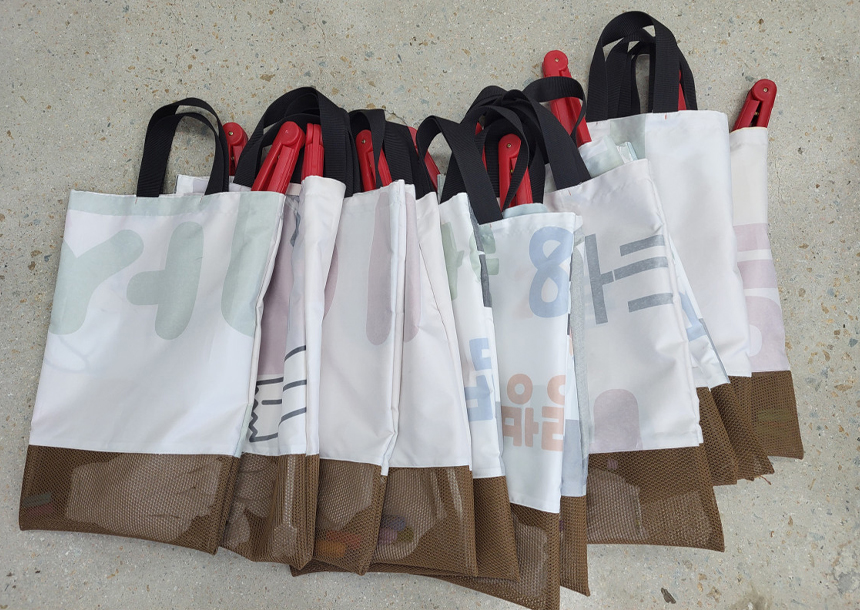 줍깅 키트는 단순히 쓰레기를 줍는 도구가 아닌 현장에서 직접 활동한 경험을 바탕으로 만들어졌습니다. 제품은 굿사이클 줍깅백 1개, 집게 1개, 장갑 1벌, 활동지 파일, 패브릭 컬러펜 3자루, 환경 굿즈 스티커 1매(랜덤)로 알차게 구성되어 있으며, 세척이 쉬운 망사 원단, 정리까지 배려한 집게 홀더, 그리고 현수막과 샘플링 원단을 다시 살려낸 업사이클 제품으로 디자인은 물론 환경을 향한 마음까지 담고 있습니다. 여기에 아이들이 직접 꾸밀 수 있는 패브릭펜과 환경 스티커까지 함께 제공해 재미와 참여의 즐거움을 더했습니다.