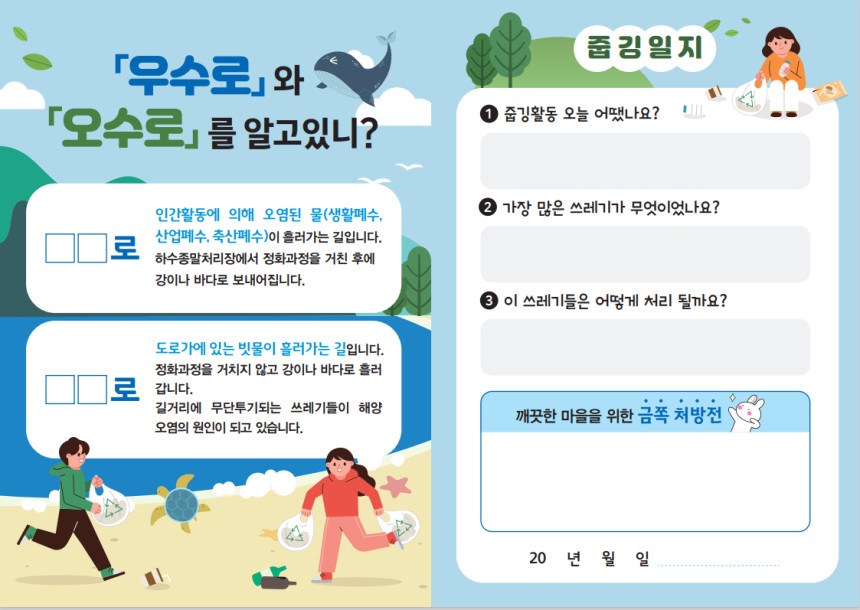 줍고 끝나는 활동이 아닌 직접 쓰레기를 줍는 경험을 통해 환경 문제를 몸으로 느낄 수 있고, 나만의 줍깅백을 꾸미는 과정을 통해 업사이클링의 의미를 체험할 수 있습니다. 활동지 학습으로는 쓰레기의 최종 경로인 ‘우수로’와 ‘오수로’의 개념을 배우며, 환경 스티커는 캠페인과 실천을 이어가는 매개체로 현장에서 직접 테스트한 구성이라 아이들의 몰입도와 흥미가 더욱 높았습니다.