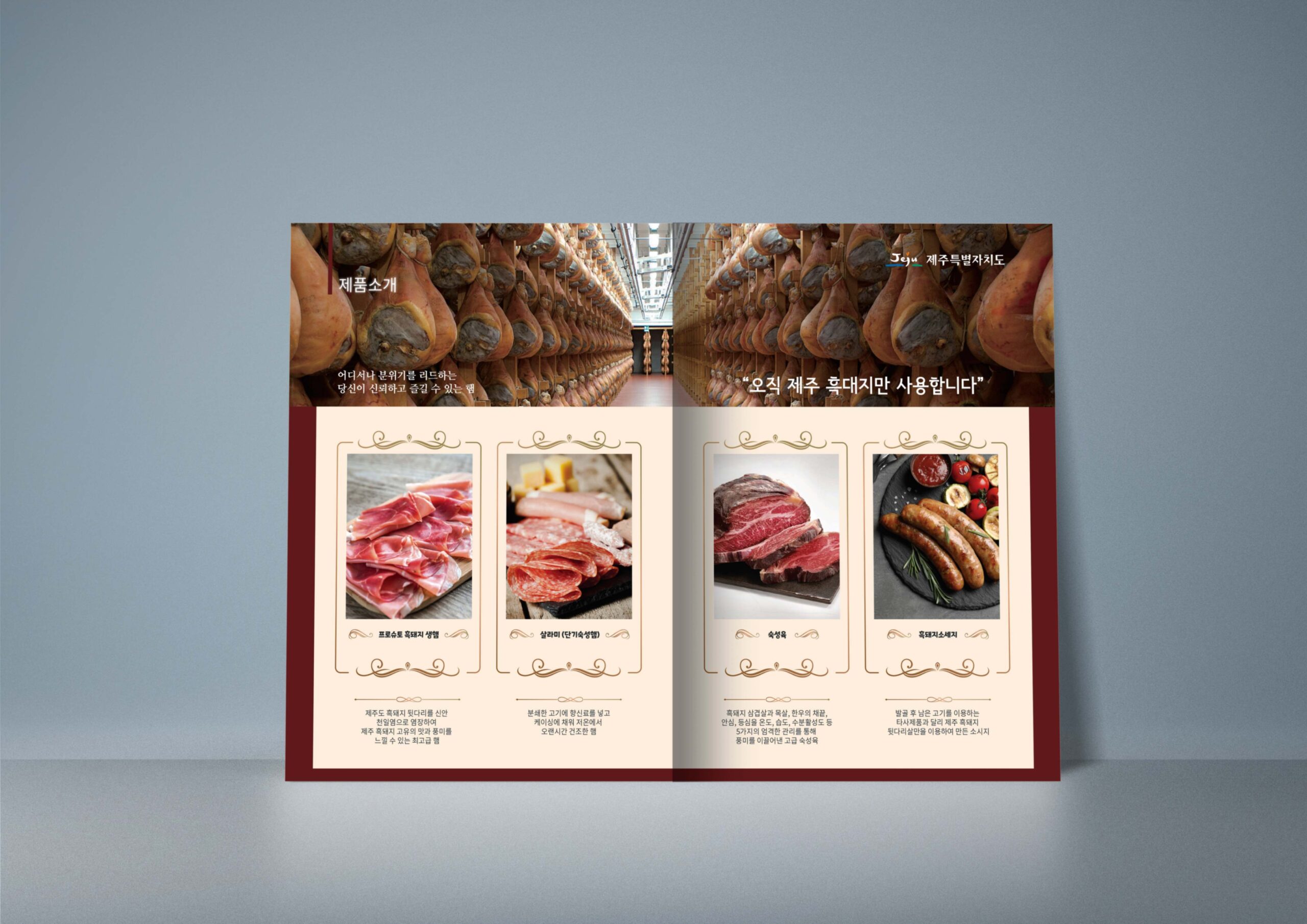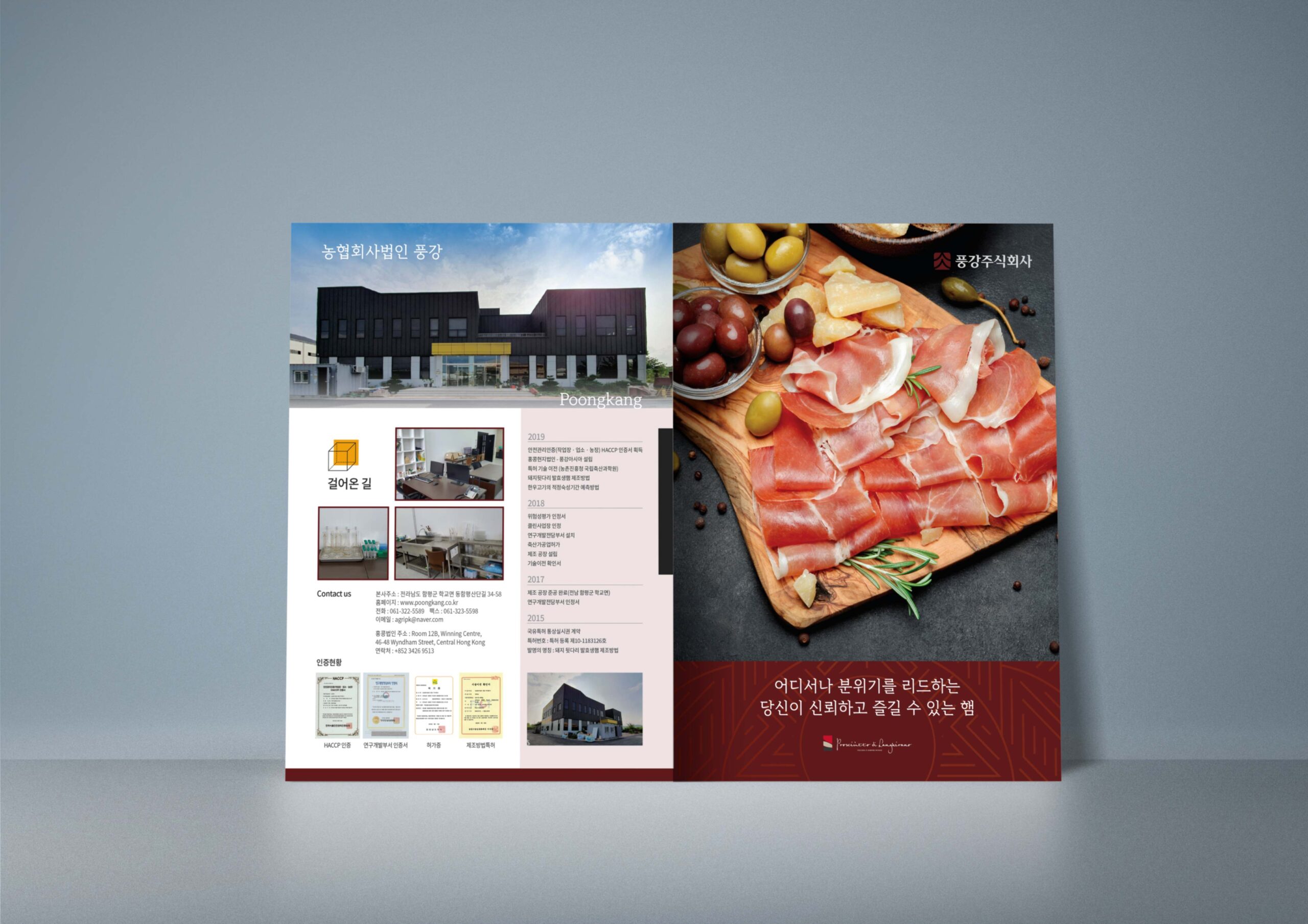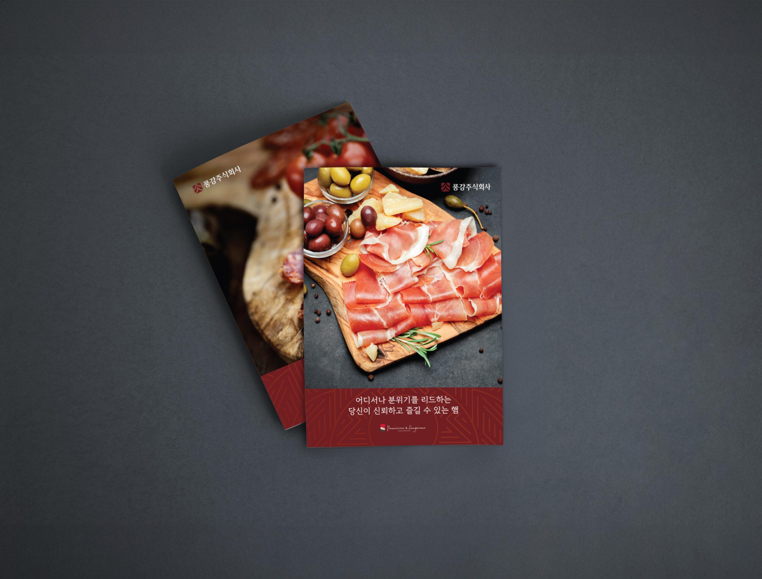 늘 도전하고 연구하는 자세로 새로운 축산가공식품 소비 문화를 만들어나가는 (주)풍강 제품 카탈로그를 제작하였다. 발효생햄의 컬러를 고급스럽게 표현하기 위해 버건디 계열의 색을 선택하였고 회사 건물의 노란색 외벽 색을 포인트 컬러로 사용하였다.