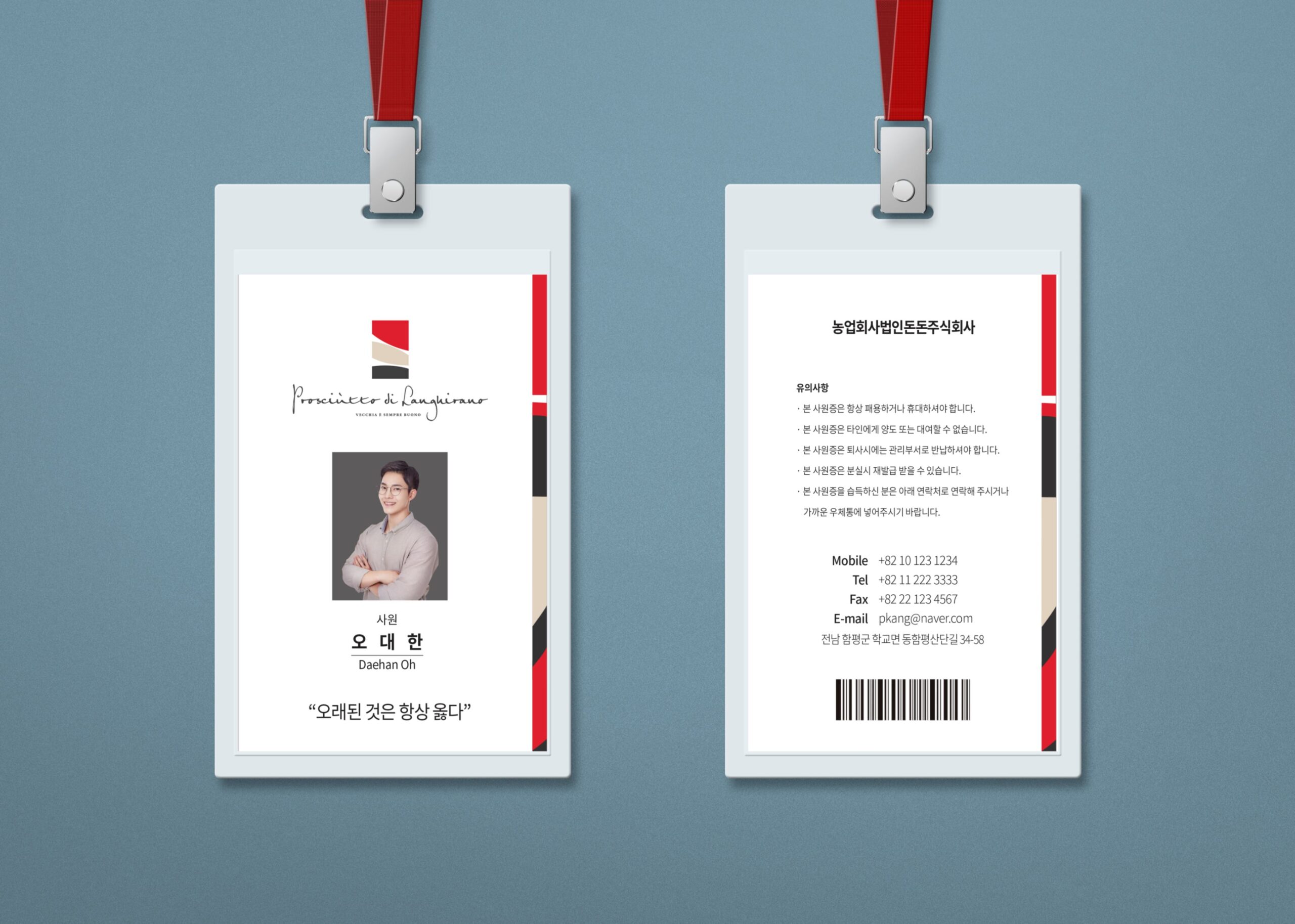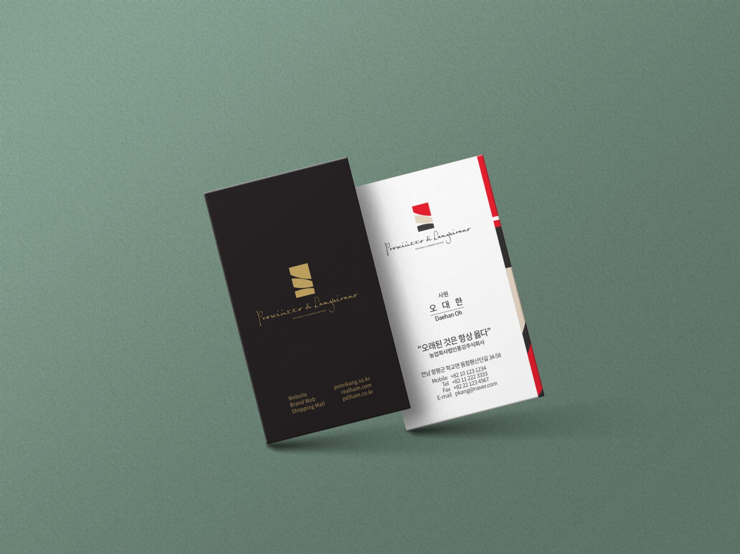 늘 도전하고 연구하는 자세로 새로운 축산가공식품 소비 문화를 만들어나가는 (주)풍강 명함, 사원증, 봉투, 카탈로그 제작 • • • • 농업회사법인 풍강주식회사는 축산가공식품 분야에서 기술적으로 가장 높은 발효생햄 제조 분야를 개적한다는 정신으로 대한민국 최초로 발효생햄 대량 생상 시스템과 제조 원천 기술을 확립하였다. 와인과 프로슈토의 붉은 조화로 풍미, 숙성, 고급스러움을 담고 있는 BI를 기준으로 전체적 색을 통일하였다.