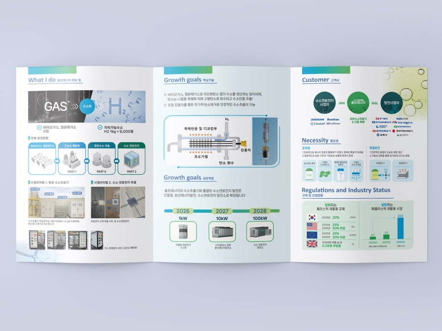 디로드는 국내 고객은 물론 해외 바이어들에게도 브랜드 인지도를 높일 수 있도록 홀트에너지의 사업과 기술을 명확하게 전달하는 총 6면으로 구성된 3단 리플렛을 제작하였다. 또한 사업 개요, 핵심 기술, 시장 현황을 체계적으로 구조화해 정보 접근성을 높이고, Hydrogen Solutions 슬로건을 중심으로 수소 산업 분야의 글로벌 리더 이미지를 강조했다.