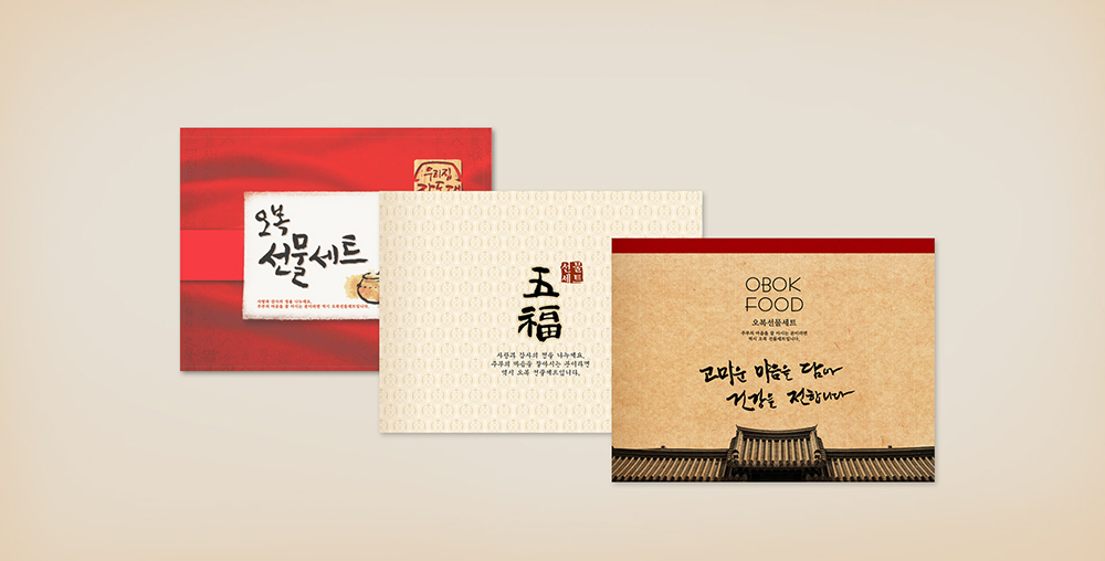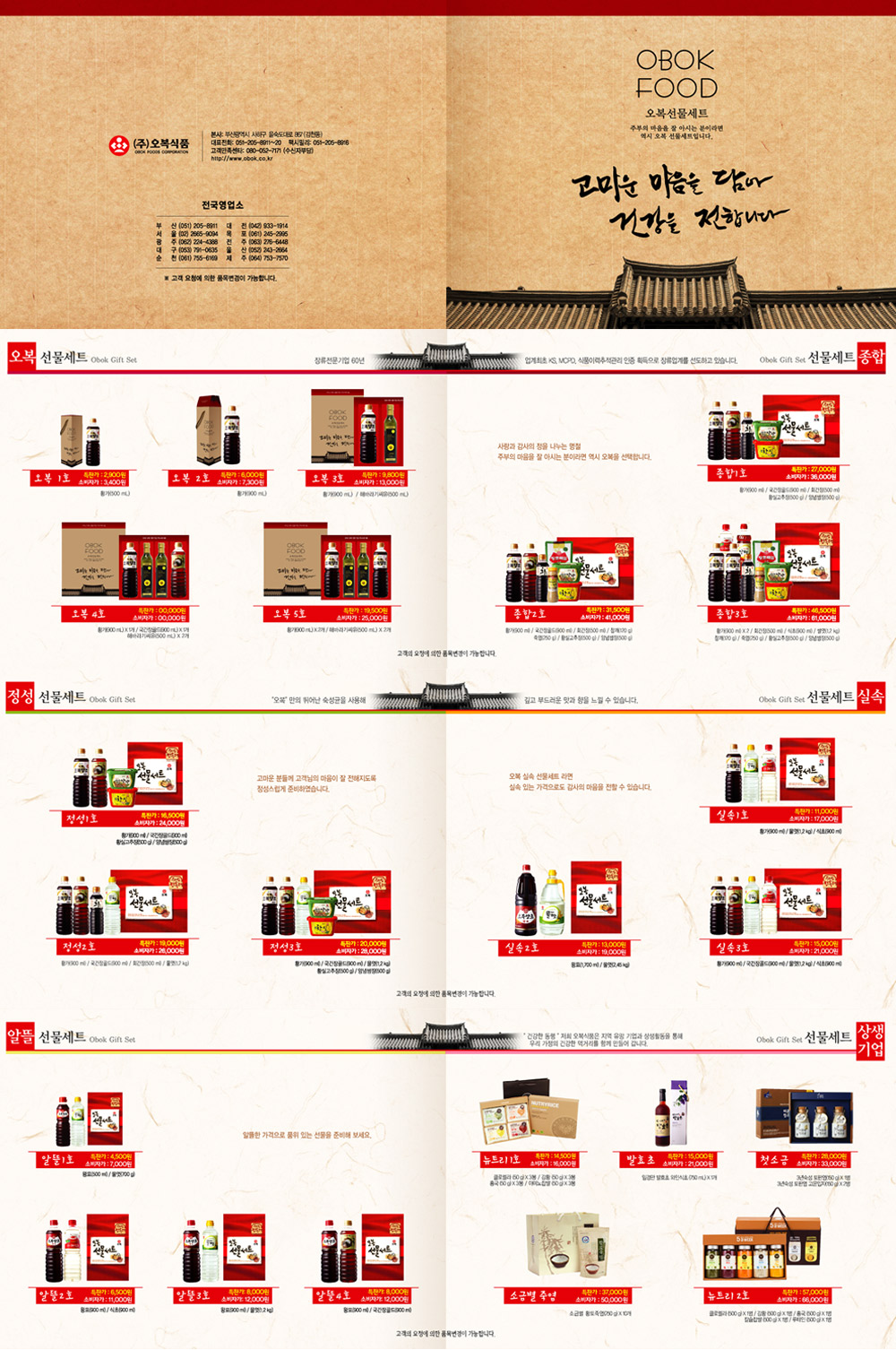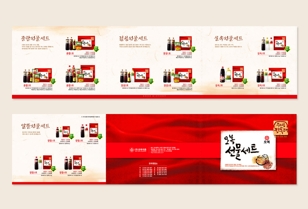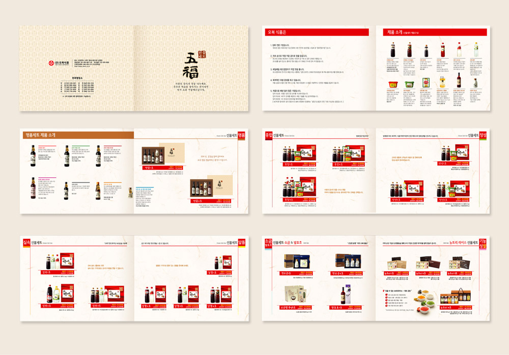 오복 선물 카탈로그 작업 • • • • 2012년, 2014년, 2017년에 걸쳐 선물세트와 선물카탈로그 작업을 진행해왔다. 60년 장류전문기업의 전문성과 전통적인 느낌을 강조하였고, 고급감을 높일 수 있게 작업되었다.