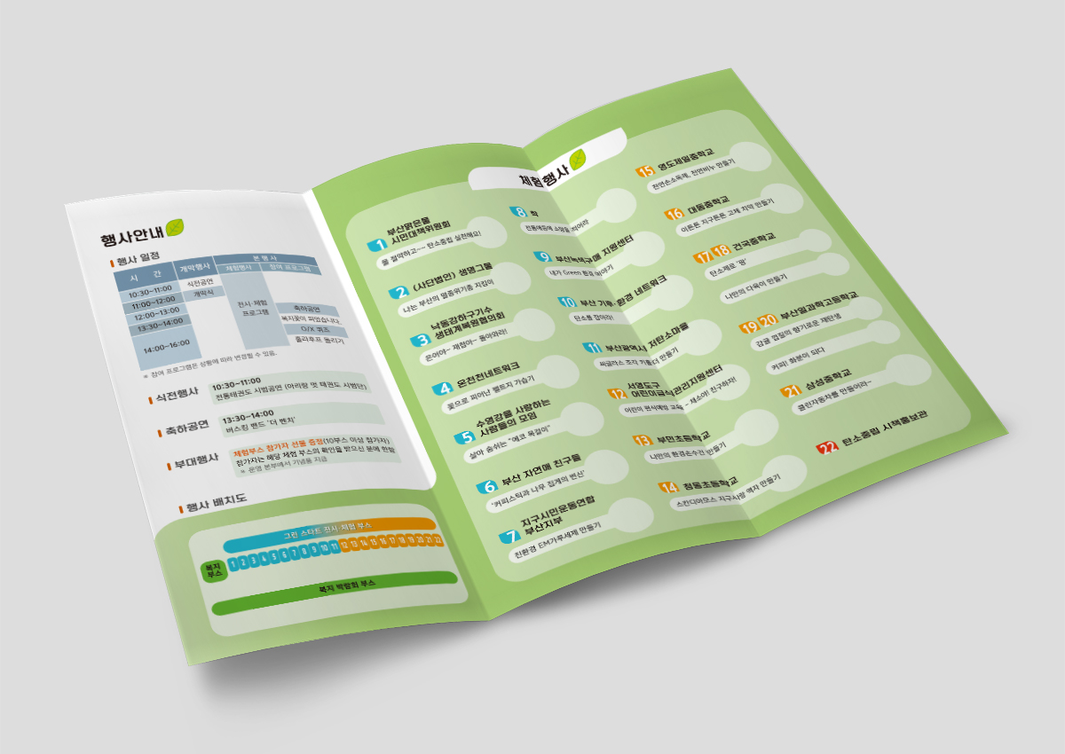 ‘그린스타트 환경문화제’라는 행사 명칭에 어울리는 녹색 계열의 컬러를 사용하고, 명도가 높은 컬러를 사용하여 경쾌함과 친환경 이미지를 중점으로 디자인하였다. 체험부스를 돌아다니면서 다양한 활동을 진행 하면서 확인용 스탬프를 찍을 수 있도록 스탬프란을 추가하여 참여자 활동이 가능한 요소를 추가하였다.